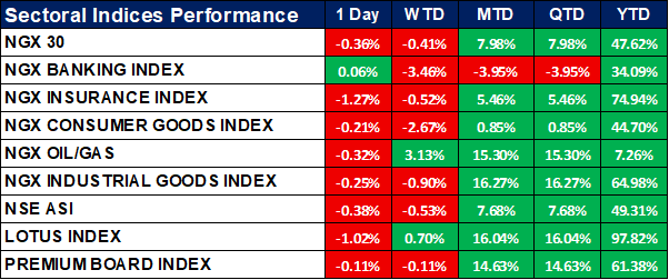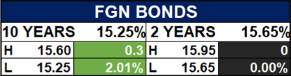 - KEDCO to install 128,000 meters with $500milion World Bank loan: - The Kano Electricity Distribution Company (KEDCO) will install 128,000 free prepaid meters across Kano, Katsina, and Jigawa using a $500 million World Bank loan to improve efficiency and end estimated billing. - Dailytrust - Nigeria Sectoral Indices Performance- The table below shows that the Most sectoral indices declined on a 1-day and week-to-date (WTD) basis, with NGX Insurance (-1.27%) and Lotus Index (-1.02%) showing notable drops. The NGX Oil/Gas index stands out with a positive WTD gain of 3.13%, reflecting some sector strength despite a slight 1-day dip. Year-to-date (YTD) performance is strong across all indices, led by the Lotus Index (97.82%) and NGX Insurance Index (74.94%), indicating solid longer-term growth. - Fixed Income (FGN Bonds)