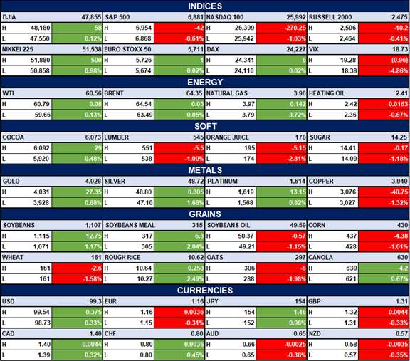 The table below depicts that the Major indices showed mixed performance: DJIA and Nikkei 225 rose, while S&P 500 and NASDAQ 100 declined sharply. Energy prices were mostly steady with slight gains in WTI, Brent, and natural gas, but heating oil dipped. Commodities saw gains in gold, silver, and some grains like soybeans, while copper, lumber, and orange juice fell; USD strengthened versus most currencies except JPY.