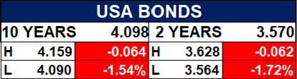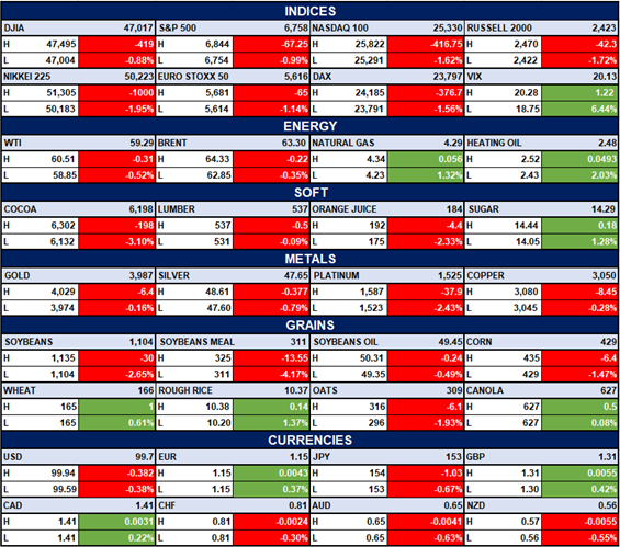 The table below depicts that the Global markets traded mostly lower as major U.S. and European equity indices declined, while the VIX spiked over 6%, signalling increased risk-off sentiment. Energy was mixed with slight losses in oil but gains in natural gas, while soft commodities showed volatility, particularly cocoa and orange juice. The U.S. dollar weakened slightly against peers, with mild gains seen in the euro, pound, and Canadian dollar.