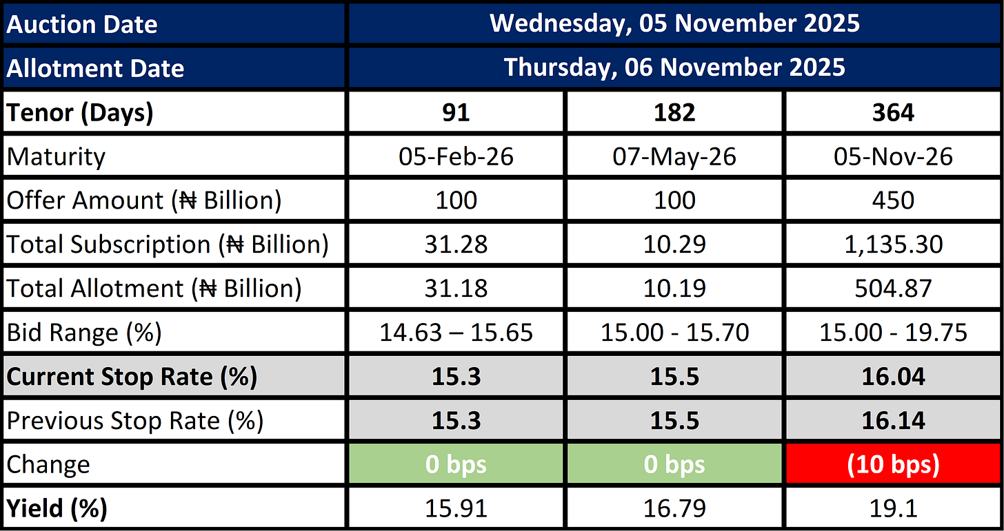 CBN’s latest T-bill auction saw strong demand, prompting a 10bps rate cut on the 1-year paper to 16.04% while other tenors held steady. - dmarketforces