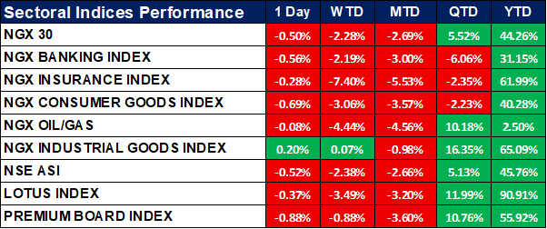 The table below shows that the Nigerian equities market closed lower as major indices declined, with the NSE ASI down 0.52% on the day and most sectors posting losses. The Industrial Goods Index was the only gainer, rising 0.20% due to resilience in key stocks. Despite the short-term pullback, Year-to-Date performance remains strongly positive across all indices, led by the Lotus Index (+90.91%) and Industrial Goods (+65.09%).