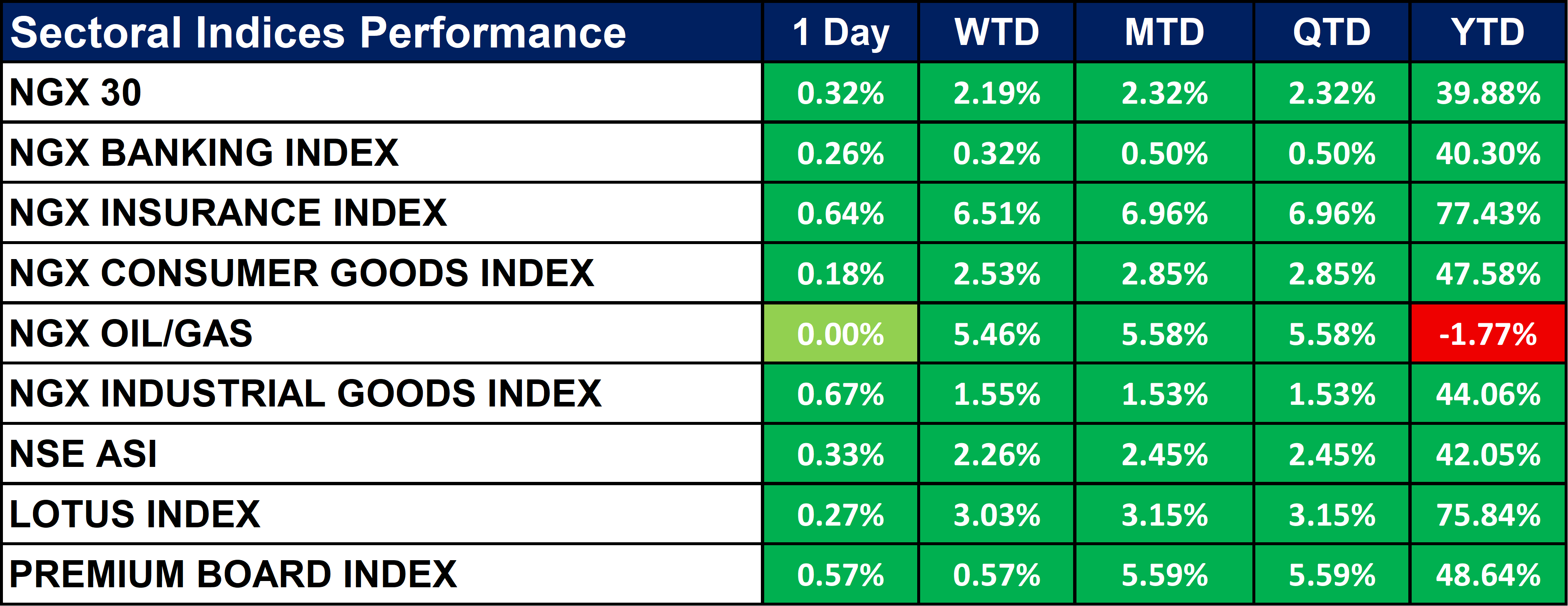 The table below shows that the NGX sectoral indices mostly closed positive across all time frames. The Insurance Index led gains YTD (+77.43%), while the Oil/Gas Index remained the only laggard (-1.77% YTD). Overall market performance (NSE ASI) was strong, up 42.05% year-to-date.