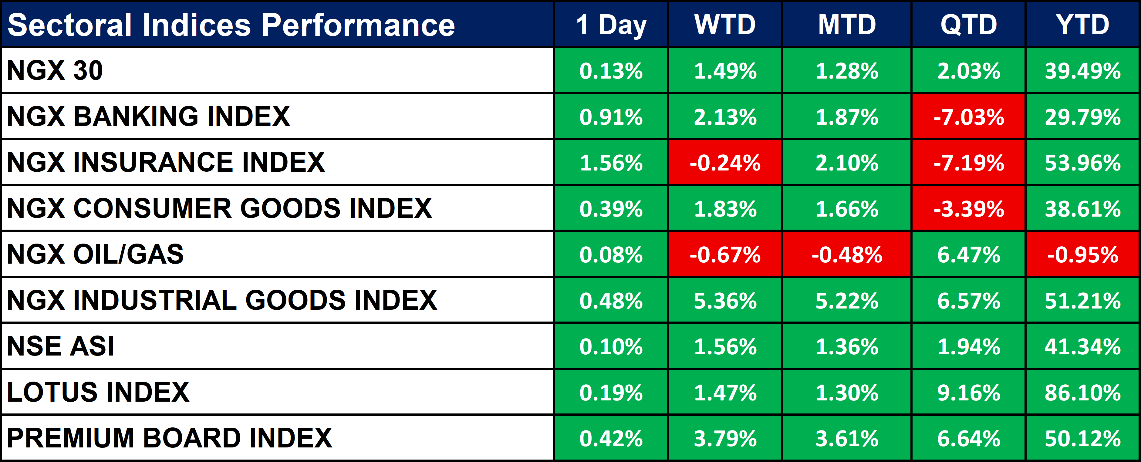 The table below shows that Most NGX sector indices posted gains across 1-Day, WTD, and MTD periods, showing broad short-term market strength. Insurance, Industrial Goods, and the Premium Board show particularly strong YTD performance, led by the Lotus Index at 86.10%. Oil/Gas and Insurance are the only sectors with notable QTD declines, despite strong overall yearly returns.