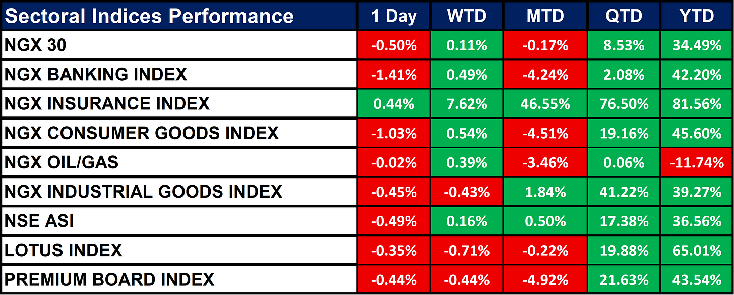 The table below shows that Most NGX sector indices fell on the day, led by declines in Banking (-1.41%) and Consumer Goods (-1.03%), while Insurance was the standout gainer with 81.56% YTD growth. Despite short-term weakness, overall market performance remains strong, with NSE ASI up 36.56% YTD; only Oil/Gas is negative year-to-date.