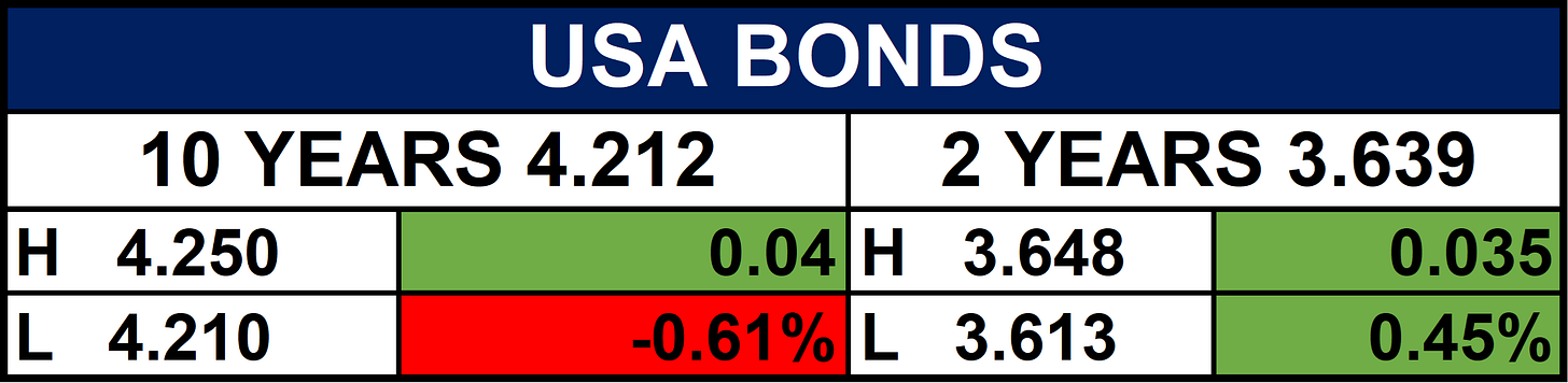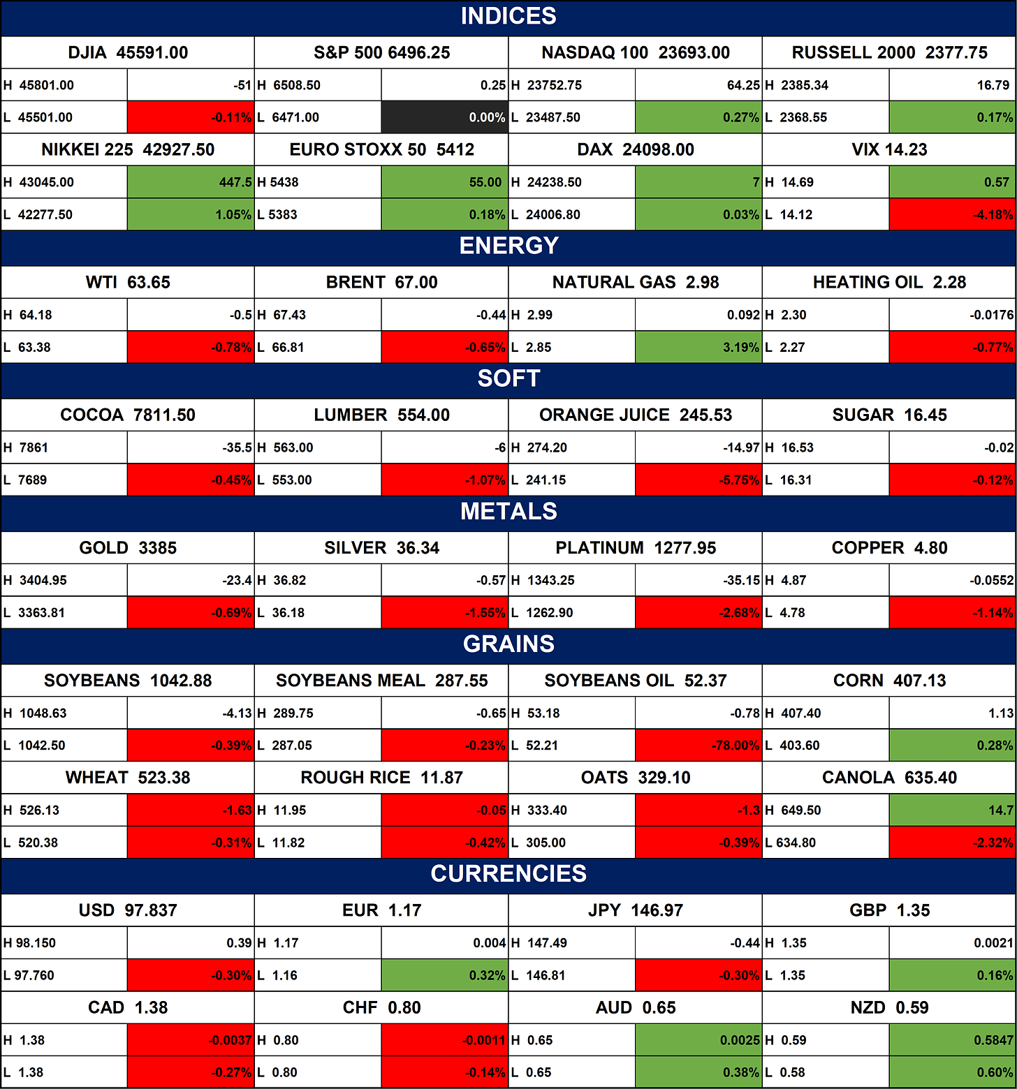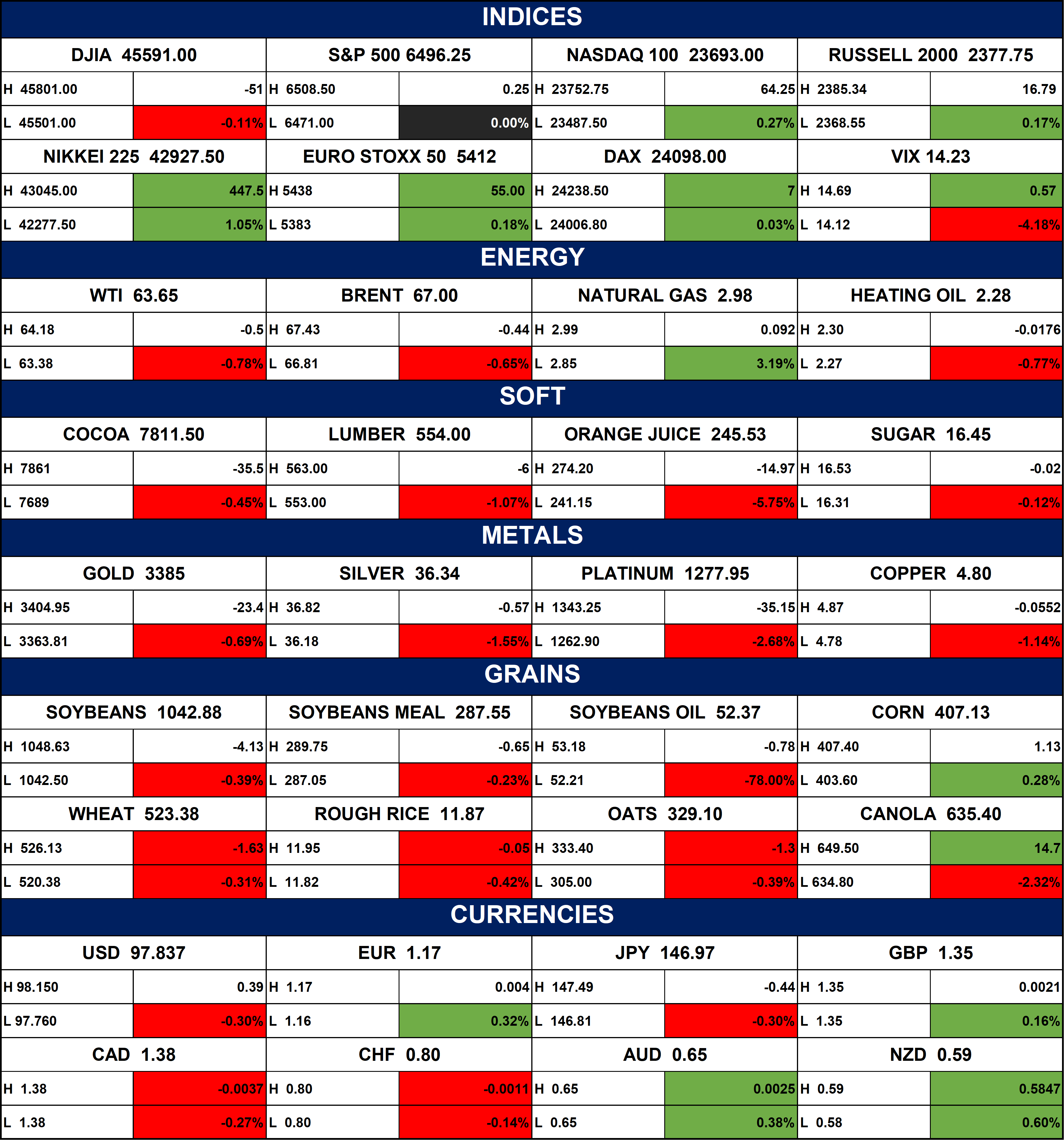 The table below depicts that global markets were mixed: stocks were steady with the Nikkei 225 leading gains, while the VIX fell sharply. Energy mostly declined except for natural gas (+3.2%). Metals and most soft commodities dropped, led by orange juice (-5.8%). Grains were mostly flat, with canola up (+2.3%). The USD weakened slightly, while EUR and NZD gained.