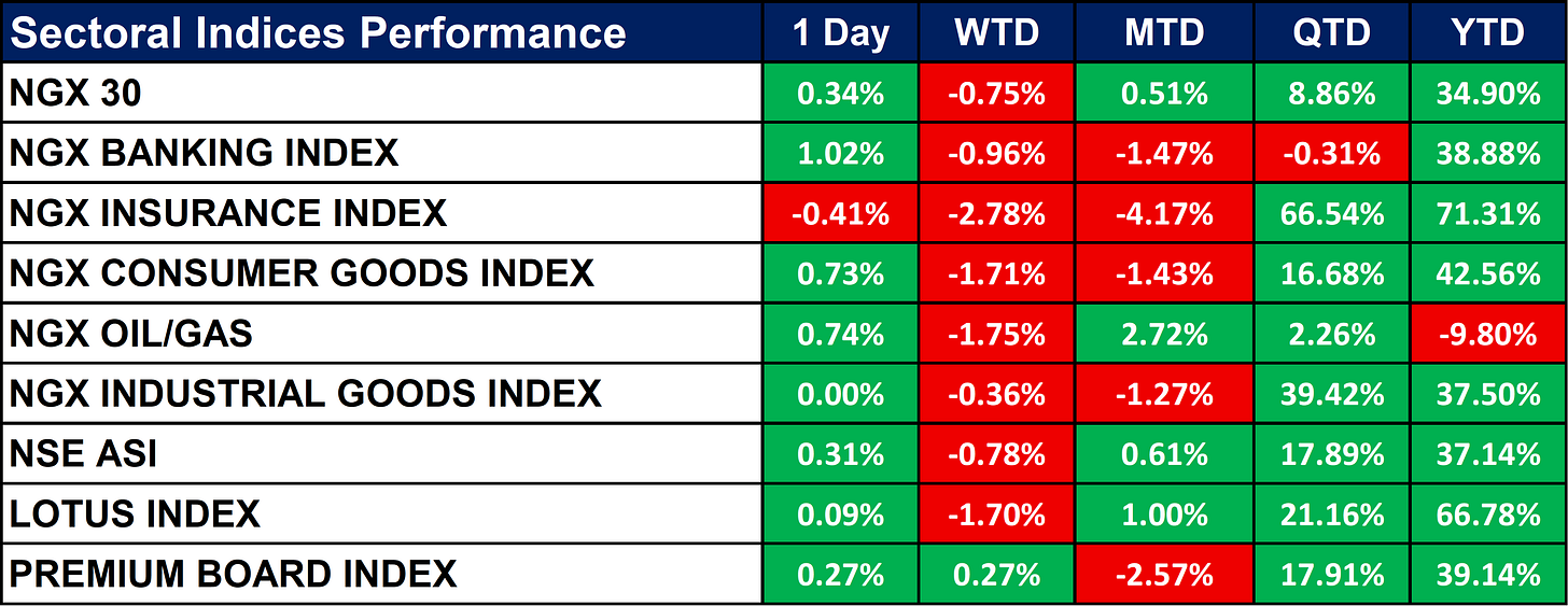 The table below shows that the Nigerian equities showed mixed short-term performance with modest daily gains across key sectors, though weekly and monthly trends remain broadly negative. Over the longer term, sectoral returns are strong, led by Insurance, Lotus, and Consumer Goods, while Oil/Gas is the main laggard year-to-date.