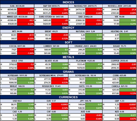 The table below depicts that the Global markets were cautious: equities broadly declined, commodities traded mixed with metals outperforming, and currencies saw a firm USD against weaker EUR and GBP.