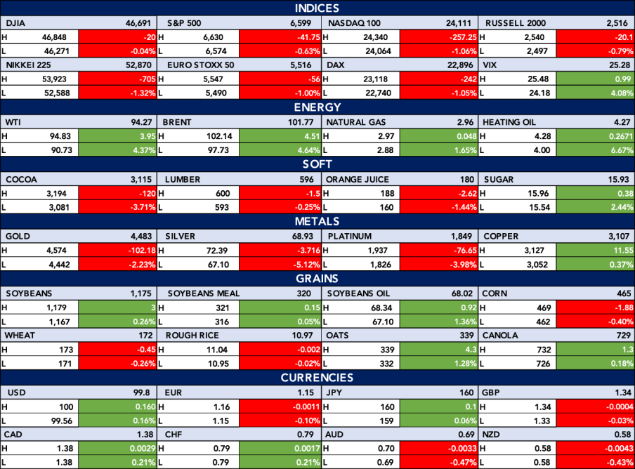 The table below shows Global equities declined across major indices including the S&P 500, NASDAQ 100, DAX, and Nikkei 225, while the VIX rose, pointing to increased market volatility. Energy markets were broadly stronger, with gains in WTI Crude Oil and Brent Crude Oil, supported by firm demand dynamics. Precious metals weakened, agricultural commodities were mixed, and the U.S. dollar strengthened modestly against major peers.
