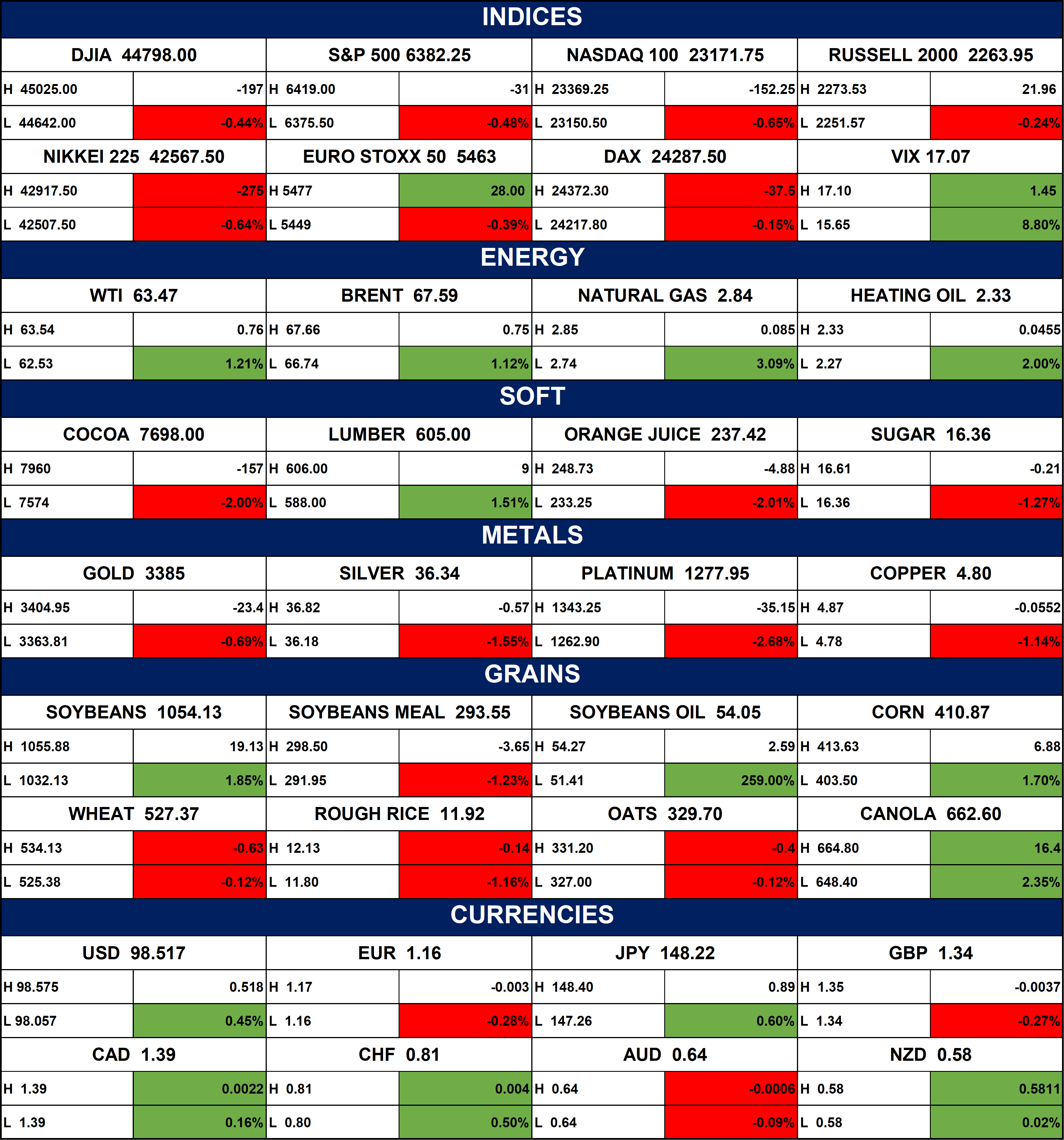 The table below depicts that Markets show broad declines in equities and metals, while energy and some agricultural commodities are seeing gains. Currency movements are mixed, with a slightly stronger USD and JPY. The spike in VIX suggests rising investor caution.