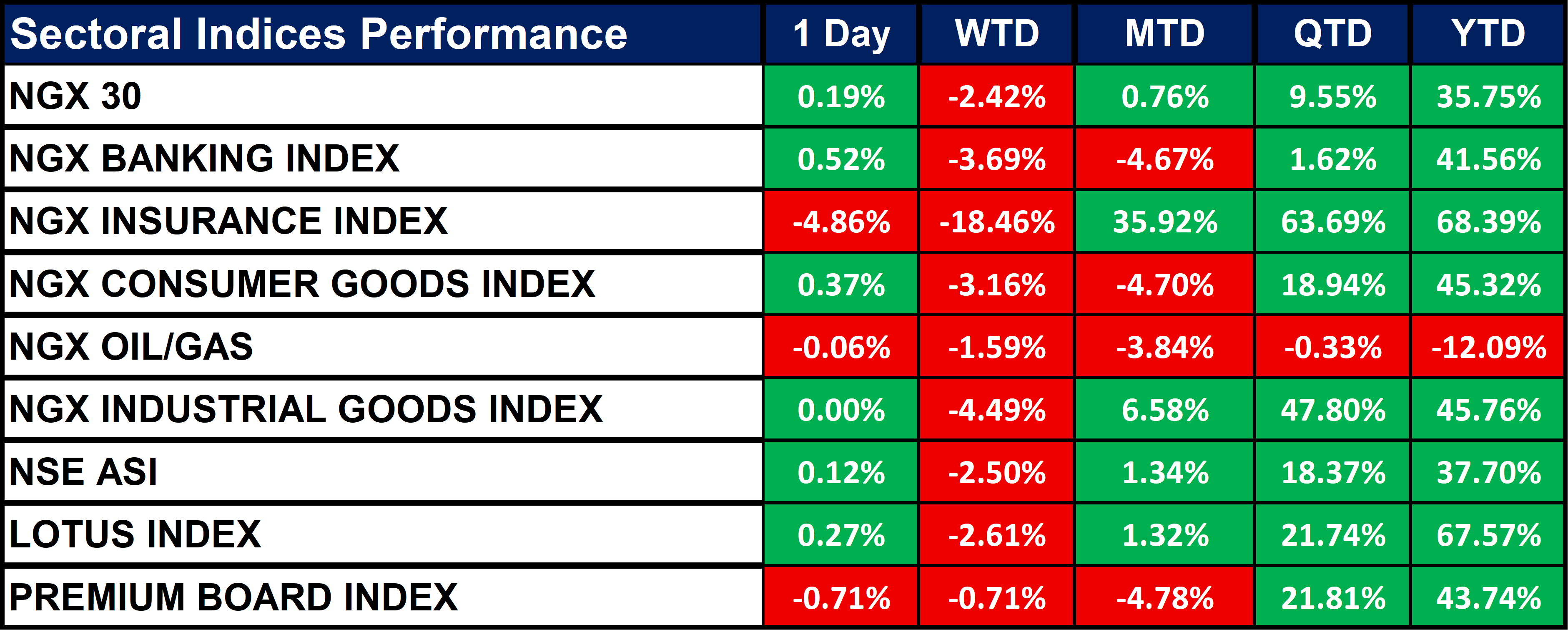 The table below shows that the table shows the performance of various Nigerian Exchange (NGX) sector indices. Most indices are down for the week (WTD), but many show strong growth for the year (YTD). The NGX Insurance Index leads with a 68.39% YTD gain, while the NGX Oil/Gas Index is the only one in decline YTD at -12.09%. Despite short-term losses, overall market performance remains positive.