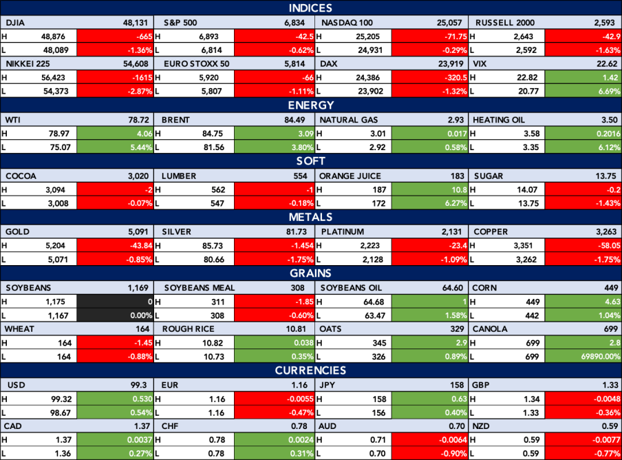 The table below shows the Global equity markets faced widespread declines today, with major indices like the DJIA, S&P 500, and Nikkei 225 all showing notable losses, reflecting cautious investor sentiment. In contrast, energy commodities such as WTI crude and Brent crude oil advanced sharply, supported by strong gains of over 3%, while natural gas and heating oil also saw positive moves. Meanwhile, precious metals and many soft commodities declined, as the US dollar strengthened modestly, adding pressure to gold and silver prices.