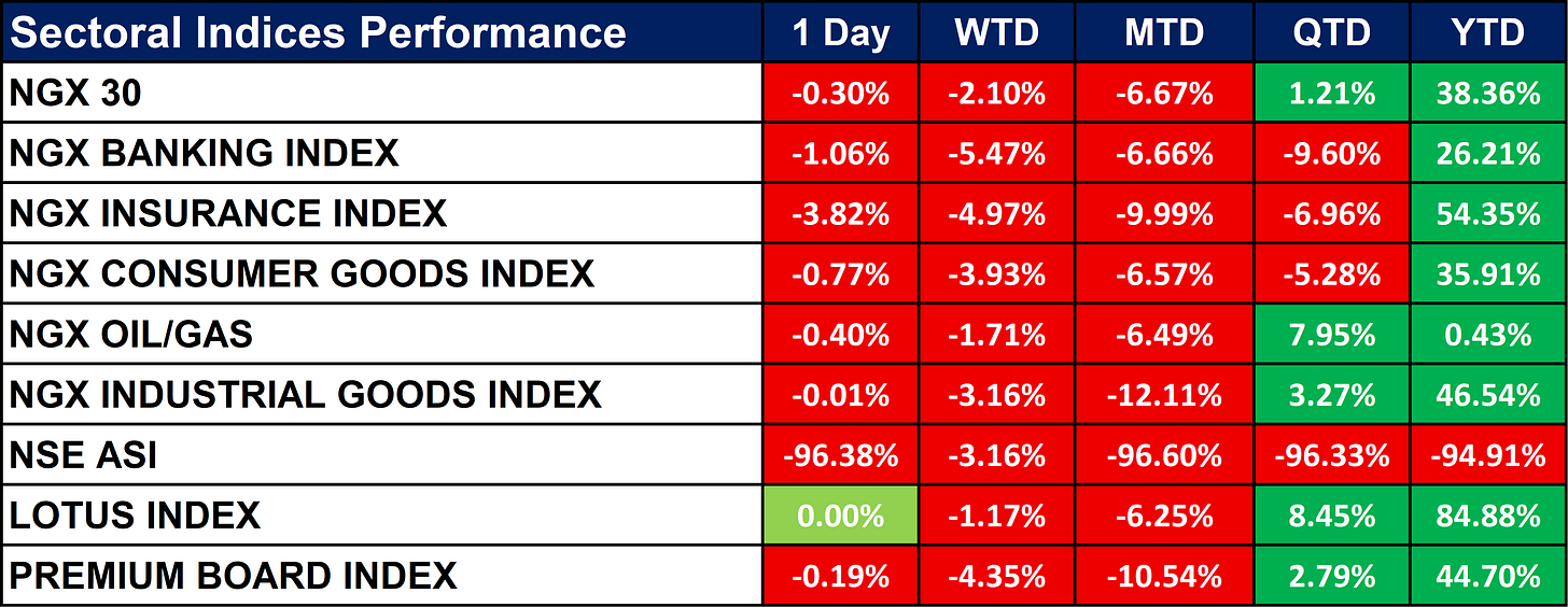The table below shows that the Most NGX sector indices posted losses across 1-Day, WTD, and MTD, reflecting broad market weakness. Despite short-term declines, QTD and YTD performance remain positive for most sectors, with the Lotus Index and Insurance Index showing particularly strong YTD gains.