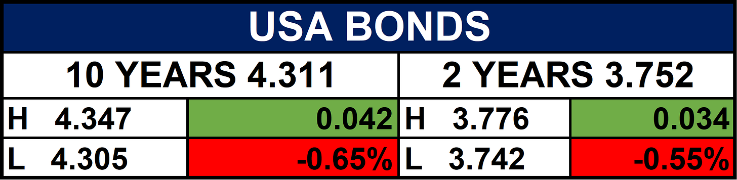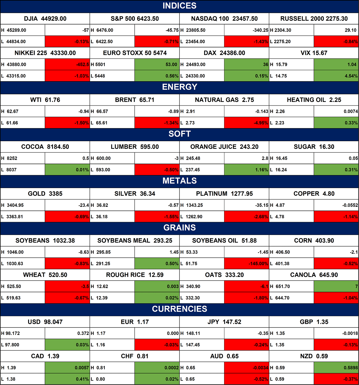 The table below depicts that the markets are mostly down across major indices, energy, and metals. Energy commodities like oil and natural gas saw notable drops. Most grains and metals also declined, while soft commodities were mixed. The U.S. dollar edged up slightly, while other major currencies were mostly flat or down. The VIX rose, signaling increased market volatility.
