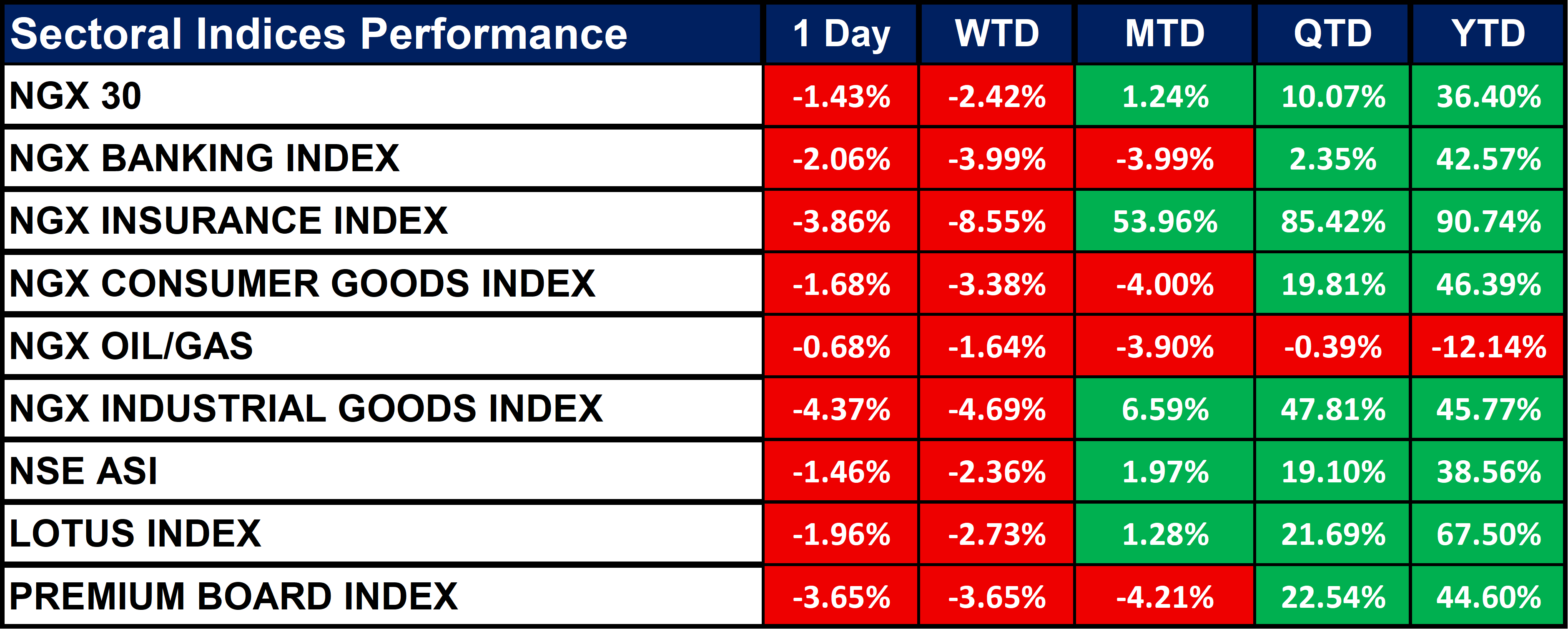 The table below shows that all NGX sector indices declined over the last day and week. However, most show strong gains year-to-date, led by the Insurance (+90.74%) and Industrial Goods (+45.77%) indices. The only sector with a negative YTD performance is Oil/Gas (-12.14%). Despite short-term losses, long-term performance remains positive overall.