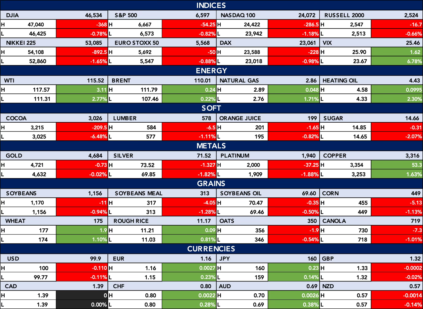 The table below shows, Global markets turned risk-averse as major equity indices declined across the U.S., Europe, and Asia, while volatility climbed, signalling rising investor caution. Energy commodities stood out as the only strong performers, with oil and gas prices advancing amid supply and demand dynamics, contrasting with broad weakness in metals, soft commodities, and grains. Meanwhile, a firm U.S. dollar and mixed currency movements reinforced a cautious macro outlook shaped by uncertainty around growth and inflation.