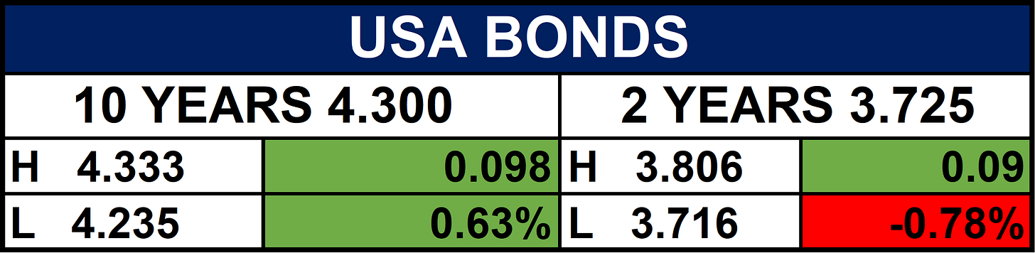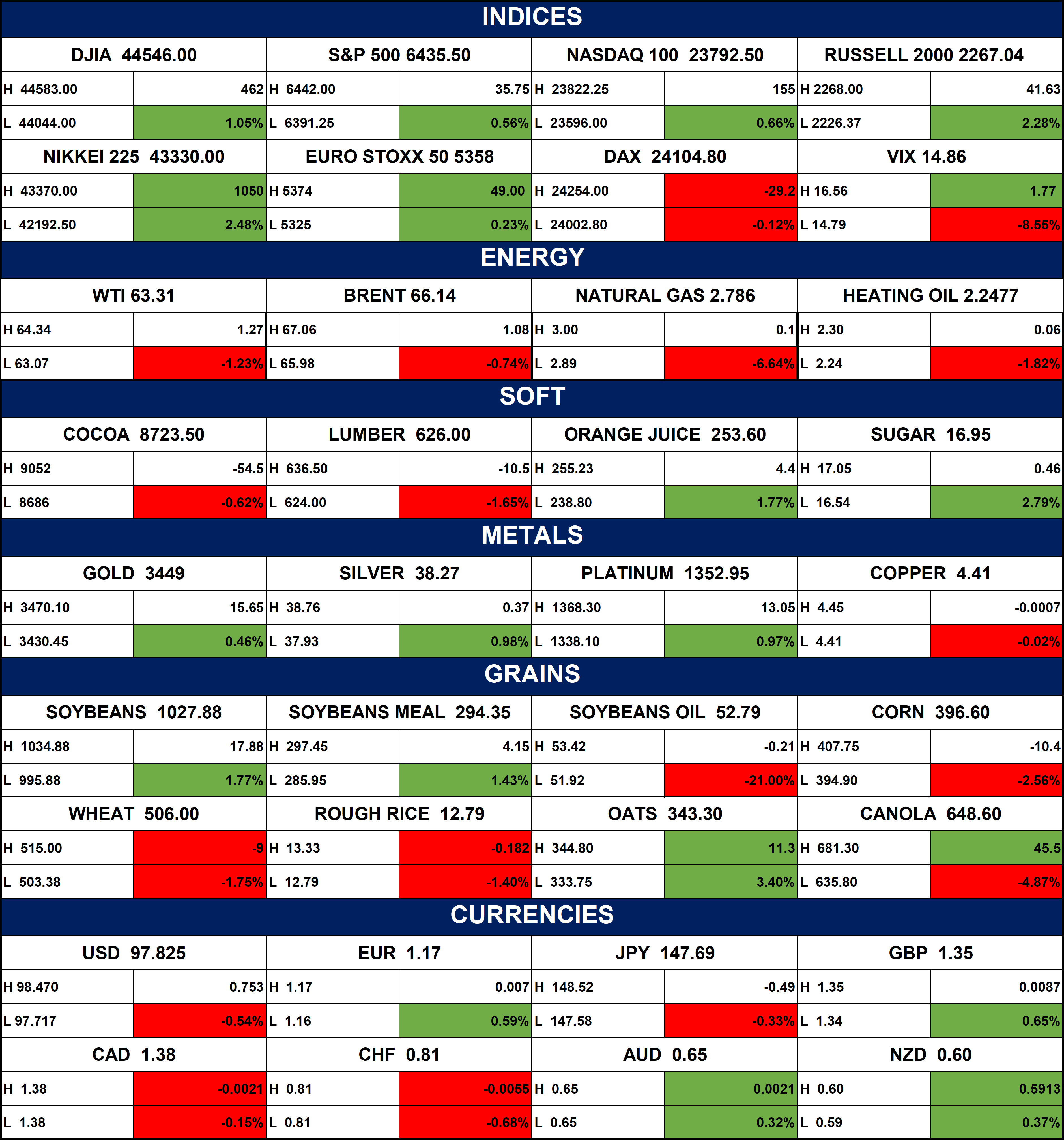 The table below depicts that the Global markets were mostly positive, with strong gains in major equity indices, especially the Nikkei 225, Russell 2000, and DJIA, while the VIX dropped sharply. Precious metals rose, most soy products gained, but corn, wheat, and canola fell. Energy was mixed, with crude oil slightly lower and natural gas plunging. Currencies saw modest moves, with USD slightly higher and some minor declines in CAD, CHF, and JPY.
