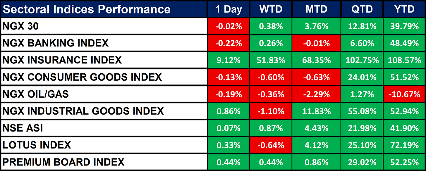 The table below shows that the The NGX market was mixed, with the Insurance Index surging 9.12% and Industrial Goods up 0.86%, while most other sectors saw slight daily losses. Year-to-date, all sectors are positive except Oil/Gas (-10.67%), with Insurance (+108.57%) far outperforming.