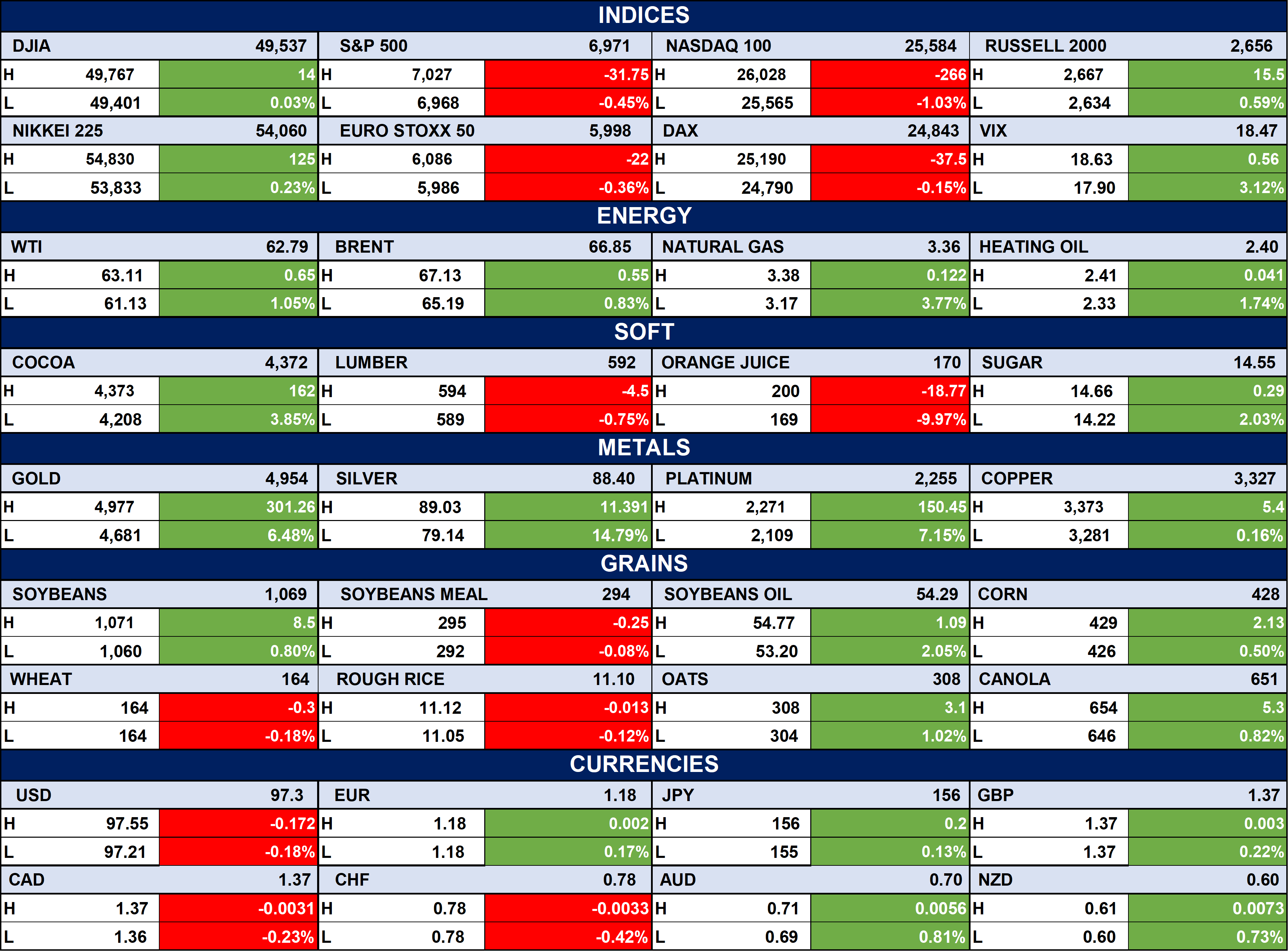 The table below depicts that the Global markets showed mixed performance: U.S. and European indices mostly down, Asian markets slightly up; commodities like gold, silver, cocoa, and natural gas are surging, while orange juice and lumber fall; USD slightly weaker versus major currencies, with AUD and NZD gaining.