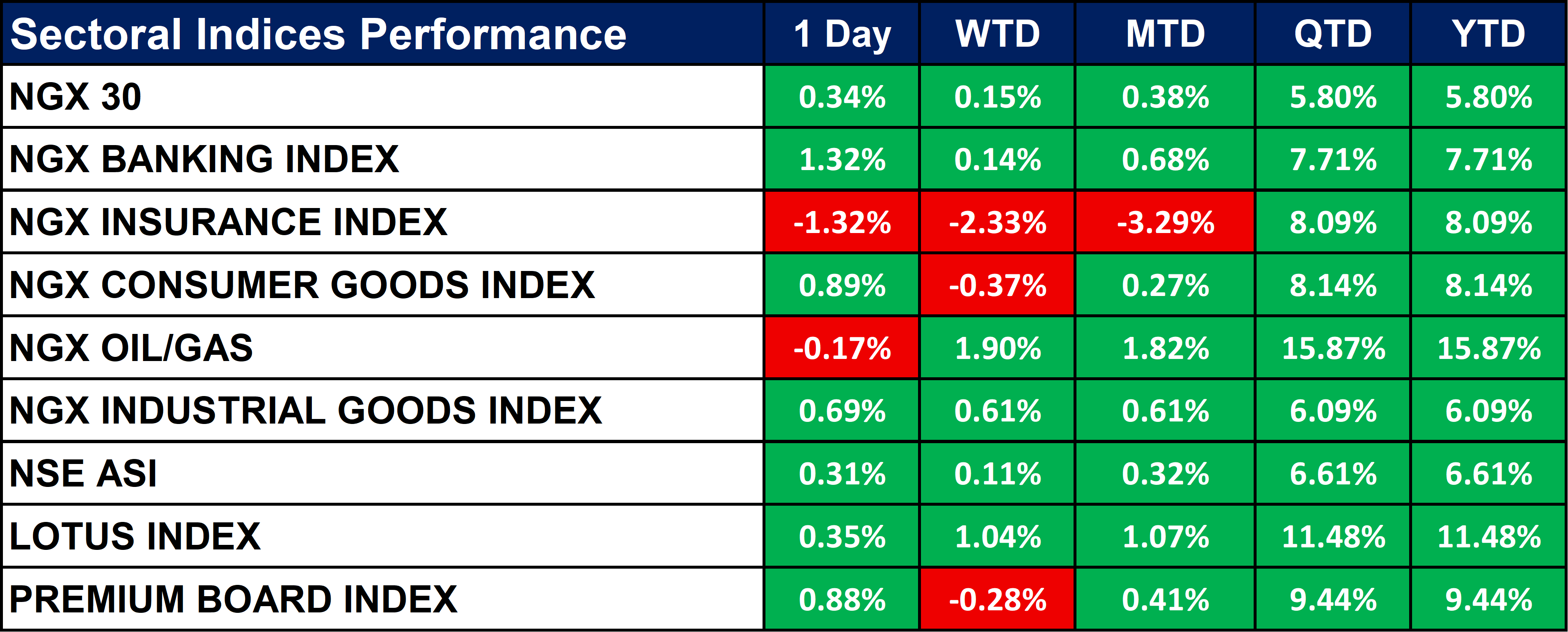 The table below shows that Most Nigerian stock indices showed modest gains over the day, with the Banking and Consumer Goods indices leading short-term performance. The Insurance index recorded the largest decline across all timeframes, while the Oil/Gas index showed strong quarterly and yearly growth despite a small daily dip. Overall, market performance remains positive year-to-date, led by the Oil/Gas, Lotus, and Premium Board indices.