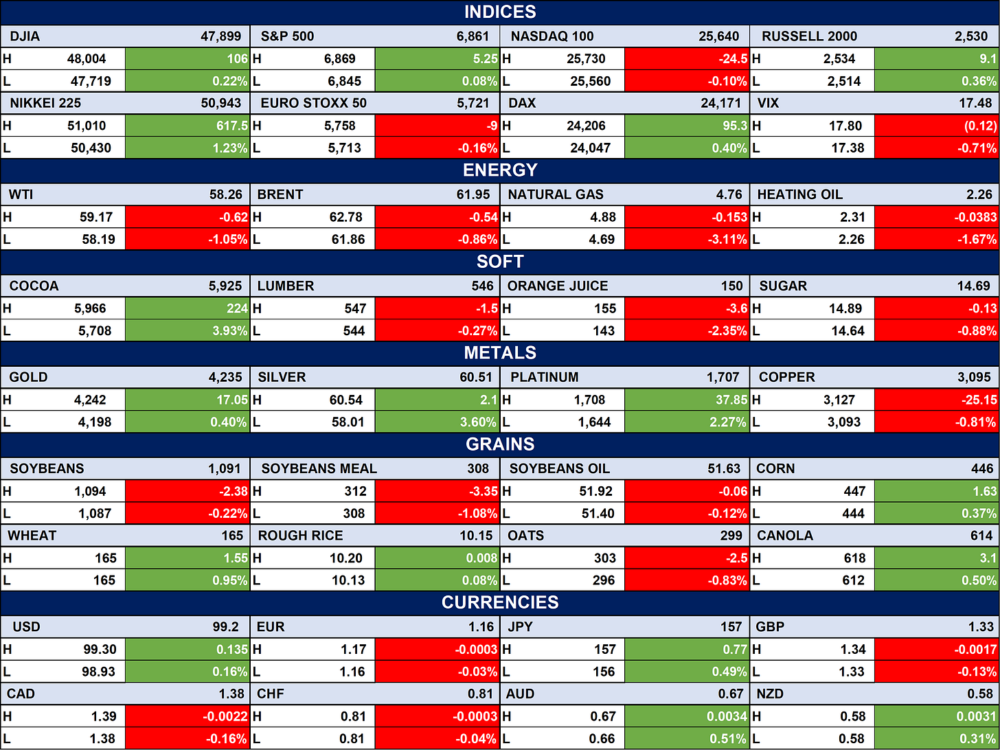 Global equity markets showed mixed performance, with the Nikkei 225 gaining over 1%, while the Nasdaq 100 and Euro Stoxx 50 edged lower. Energy prices mostly declined, with WTI and Brent crude down over 0.5%, and natural gas falling 3.1%, while heating oil also retreated. Precious metals were stronger, while grains were mixed, corn and wheat gained slightly, and soy products mostly declined.