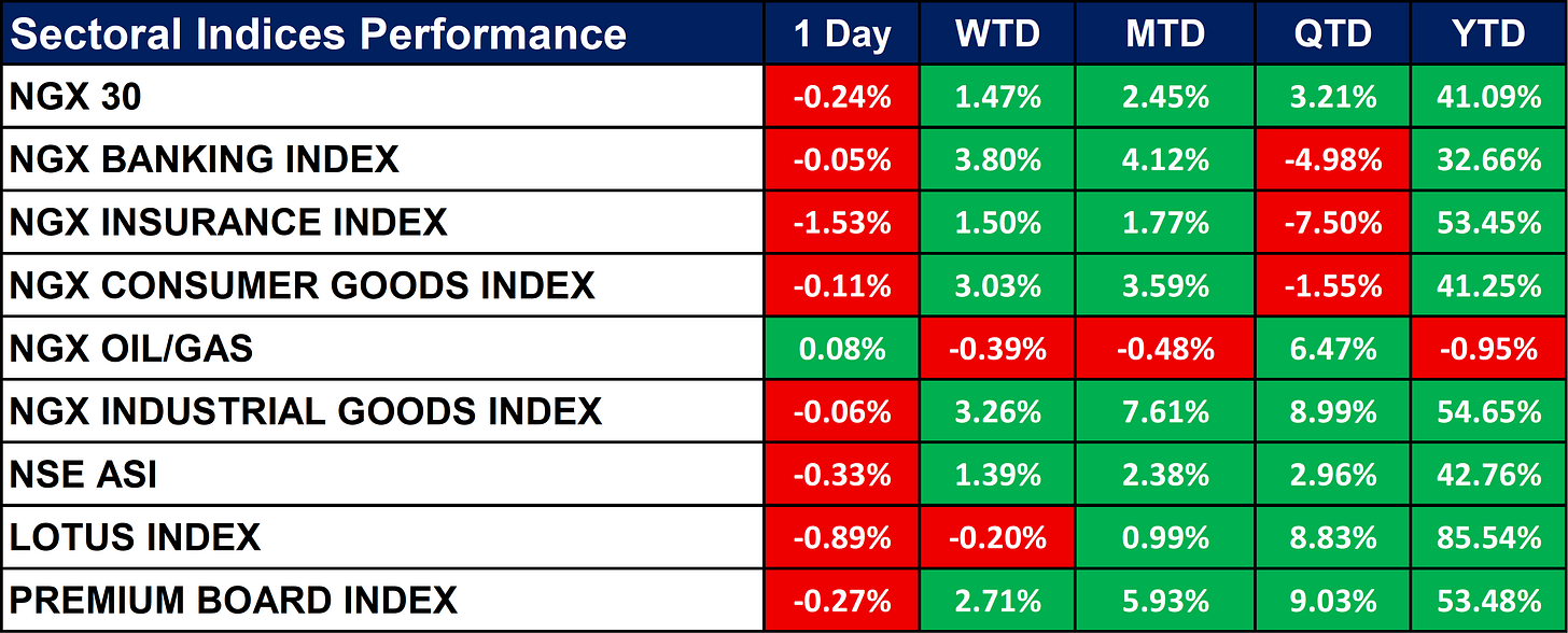 The table below shows that Most sector indices declined on the day, with Insurance (-1.53%) and Lotus (-0.89%) posting the biggest losses, while Oil/Gas inched up (+0.08%). Weekly and monthly performance remained broadly positive across sectors, showing sustained short-term strength. Year-to-date returns are strong overall, led by Lotus (+85.54%), Industrial Goods (+54.65%), Insurance (+53.45%), and Premium Board (+53.48%).