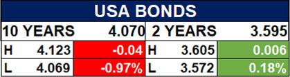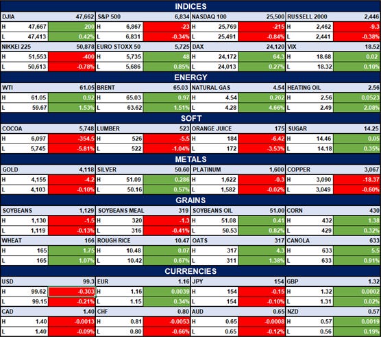 The table below depicts that the Global markets were mixed. The U.S. indices were mostly lower, with the Dow up 0.42% but Nasdaq down 0.84%. Energy commodities gained as WTI and Brent rose over 1.5%, while cocoa and lumber dropped sharply in soft commodities. The U.S. dollar weakened slightly against major currencies, while grains and metals posted modest gains.