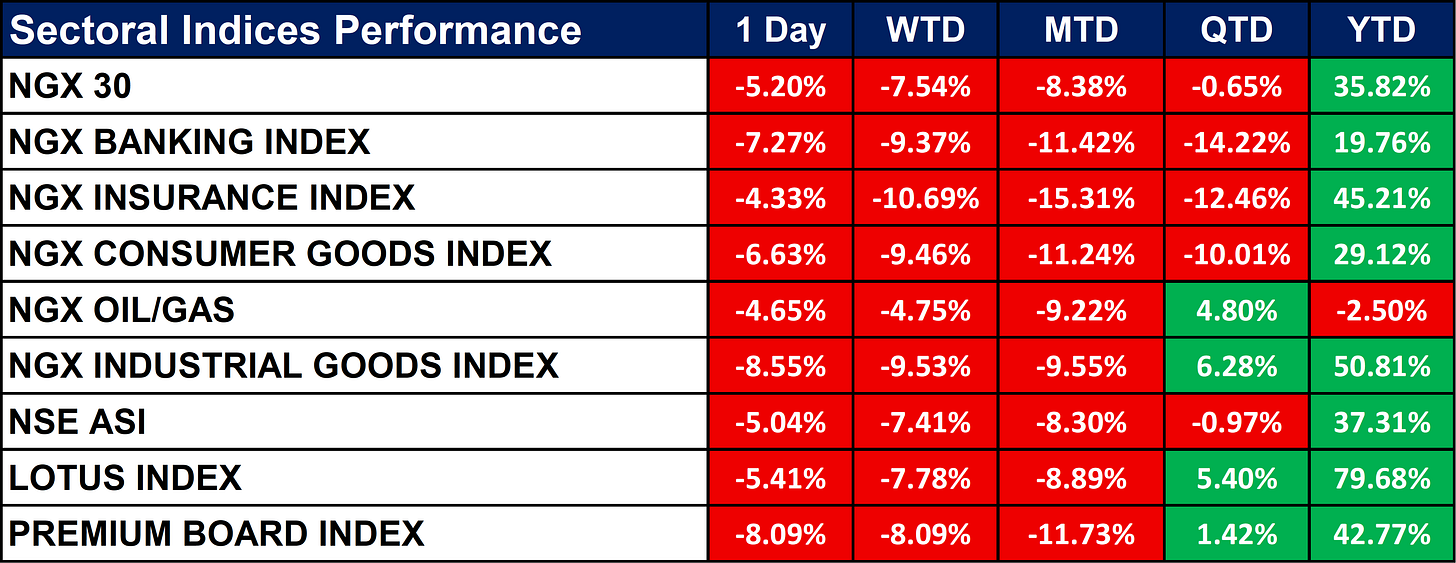 The table below shows that the NGX market saw broad losses, with all major sectoral indices declining sharply on the day led by Industrial Goods (-8.55%) and Banking (-7.27%). Week-to-date and month-to-date performances were negative across all sectors, signaling persistent market weakness. Despite recent declines, year-to-date returns remain positive, with the Lotus Index (+79.68%) and Industrial Goods (+50.81%) leading overall gains.