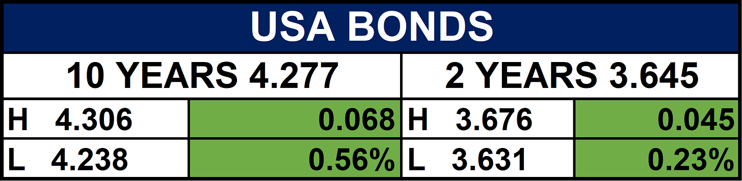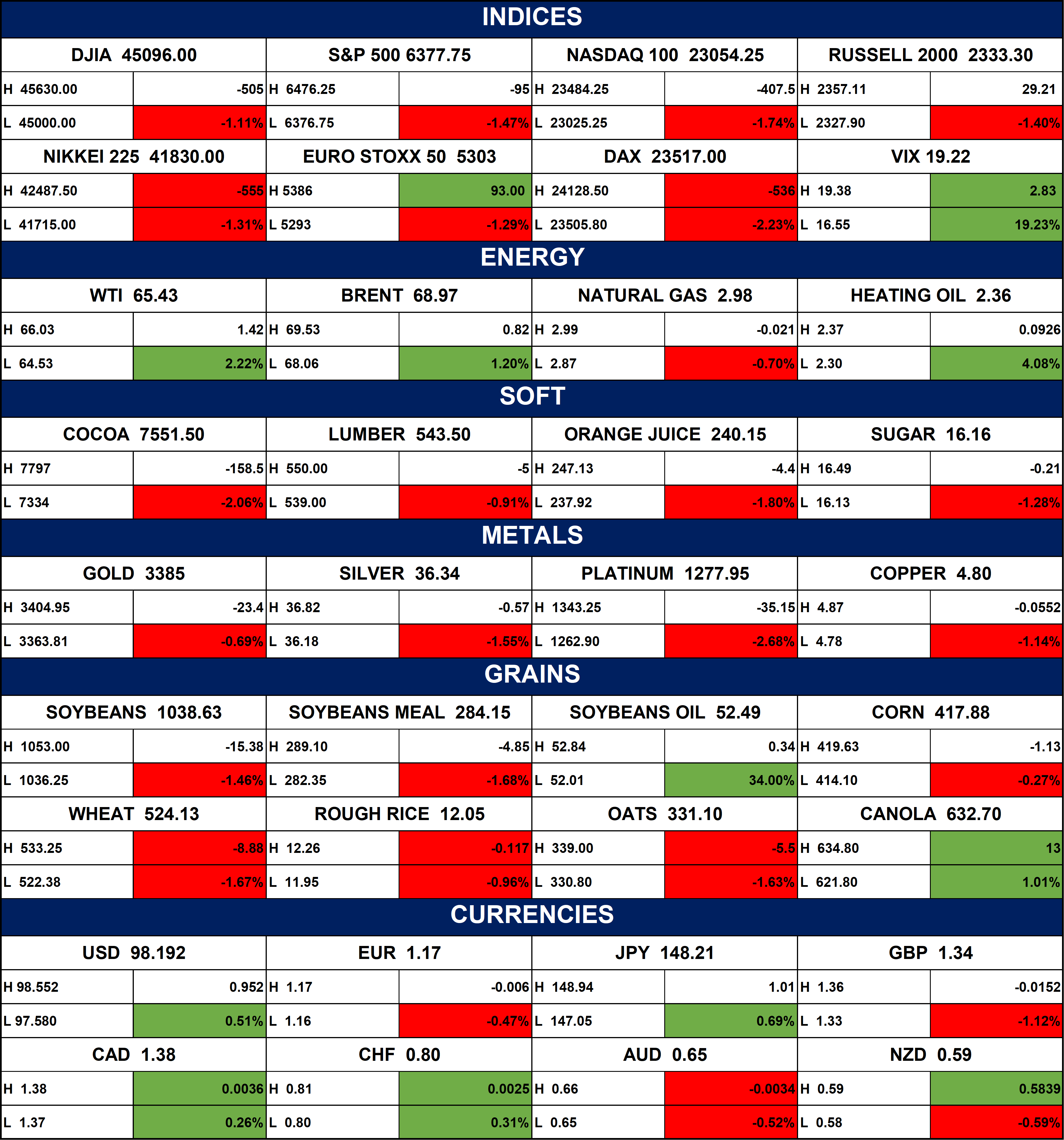 The table below depicts that the global stock markets mostly declined, with major indices like the DAX, NASDAQ, and S&P 500 down, while the Euro Stoxx 50 rose. Energy prices, especially oil and heating oil, increased. Most soft commodities and metals dropped, but some grains like soybean oil and canola gained. The US dollar strengthened slightly, while the euro and British pound weakened. Overall, markets showed caution with rising volatility.