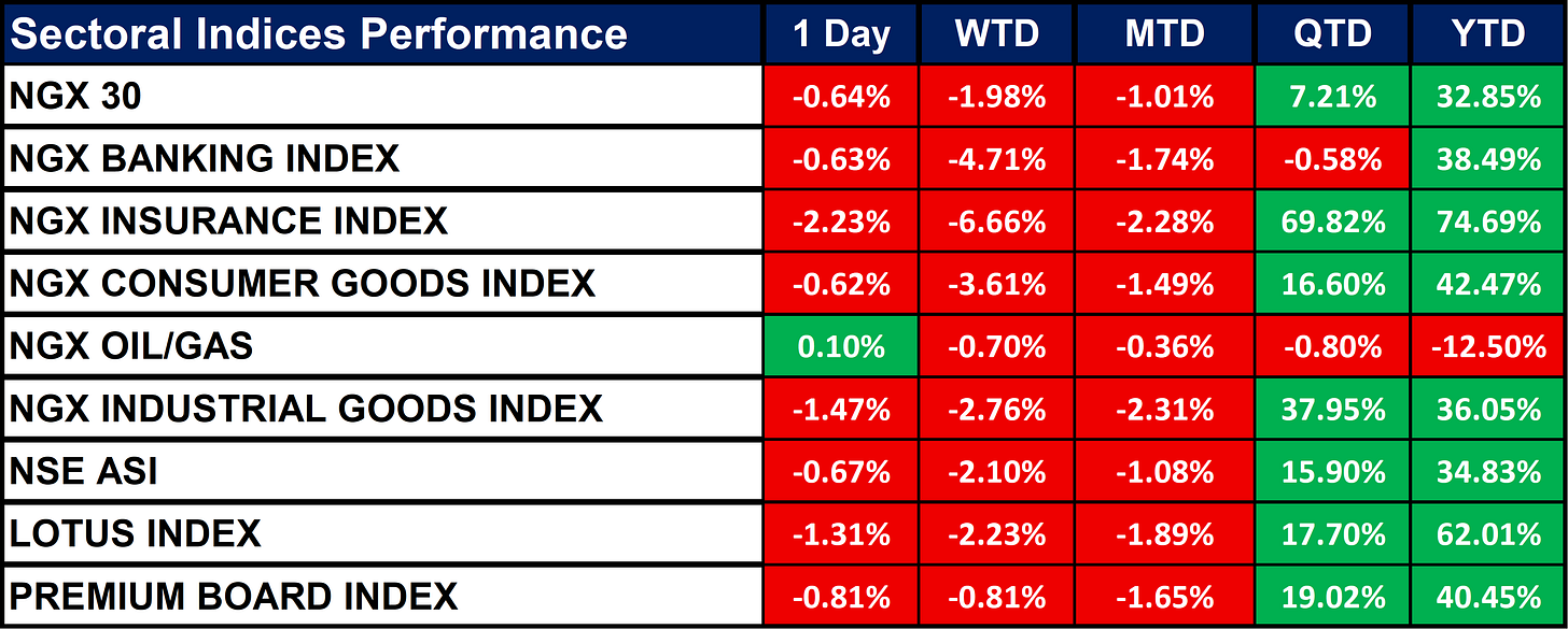 The table below shows that Most NGX sector indices declined in the short term (1-Day, WTD, MTD), reflecting negative market sentiment. However, long-term (YTD) performance remains strong, led by the Insurance Index (+74.69%), Lotus Index (+62.01%), and Consumer Goods (+42.47%). The Oil/Gas Index was the only gainer today (+0.10%) but is still the worst performer YTD (-12.50%). Despite current losses, several indices show strong Quarter-to-Date (QTD) growth, especially Insurance and Industrial Goods.