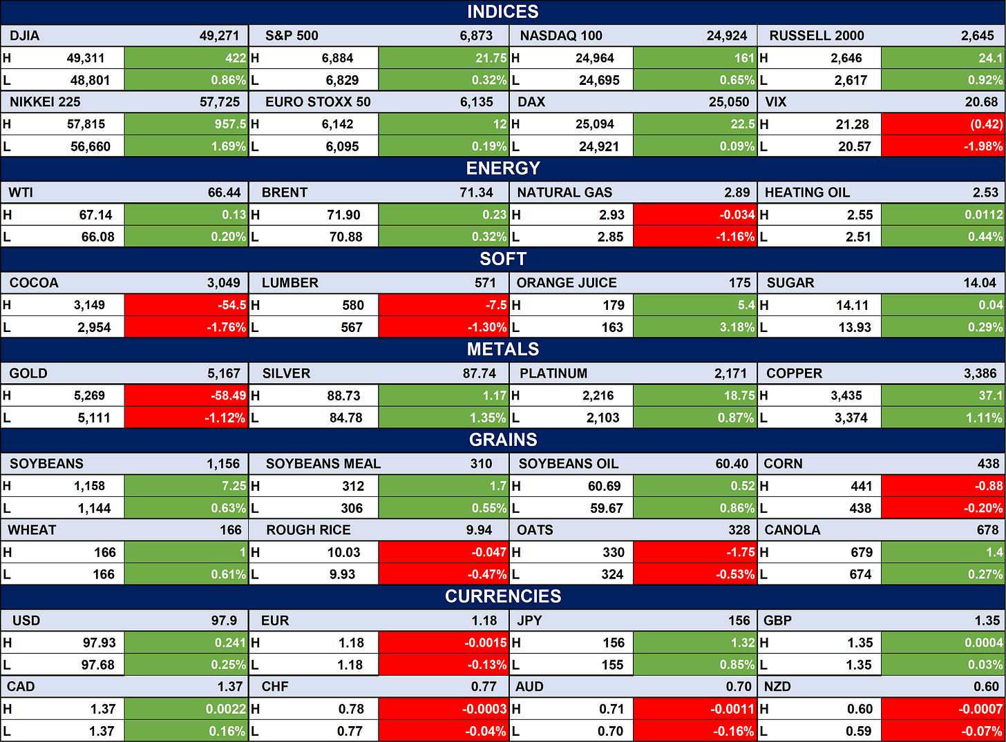The table below depicts that the Global equities closed broadly positive, with gains across the S&P 500, Nasdaq, Nikkei, and Euro Stoxx, while the VIX declined, signaling improved risk sentiment. Energy markets were mixed as WTI and Brent edged higher, natural gas softened, metals mostly advanced (silver, platinum, copper) while gold dipped, and soft commodities showed weakness in cocoa and lumber. The U.S. dollar strengthened modestly, major currencies were mixed, and grains traded unevenly with gains in soybeans and wheat while corn and oats faced mild pressure.