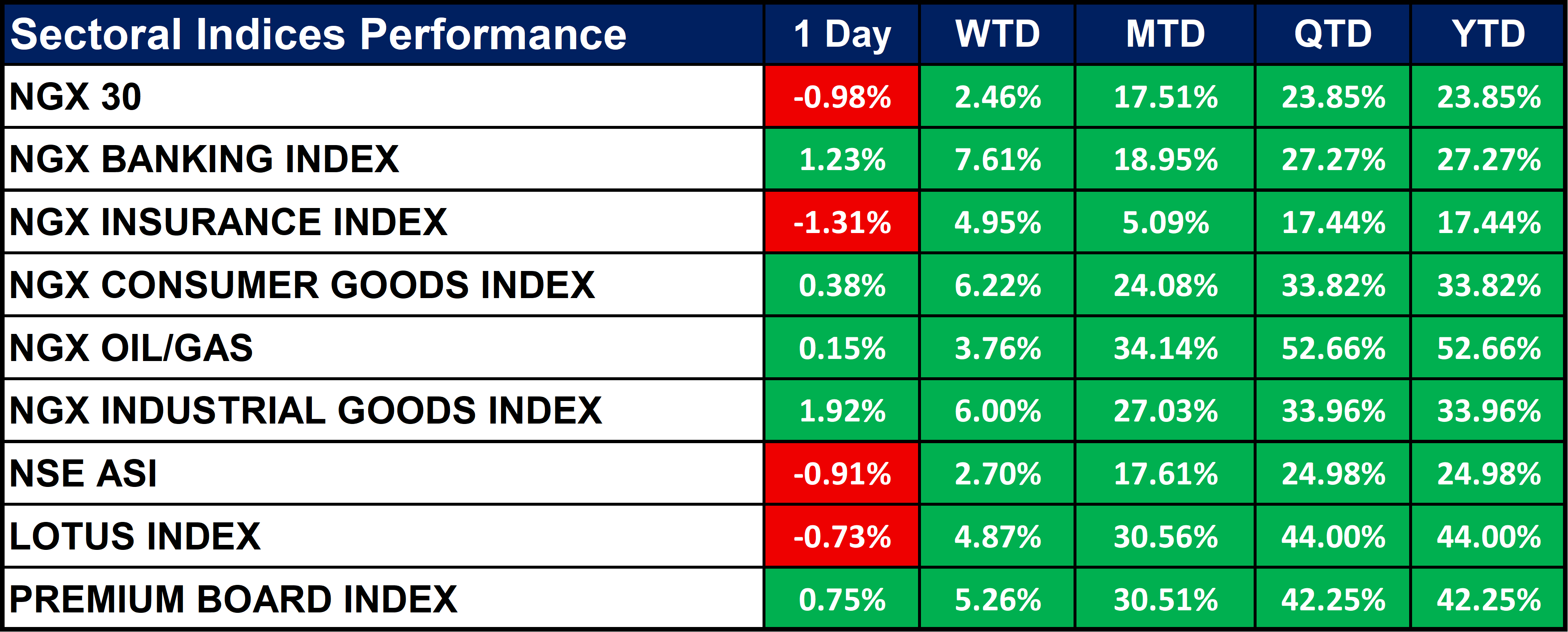 The table below shows that the NGX indices closed mixed for the day, with gains in Banking, Industrial Goods, Consumer Goods, Oil & Gas, and the Premium Board, while NGX 30, Insurance, NSE ASI, and Lotus Index declined.