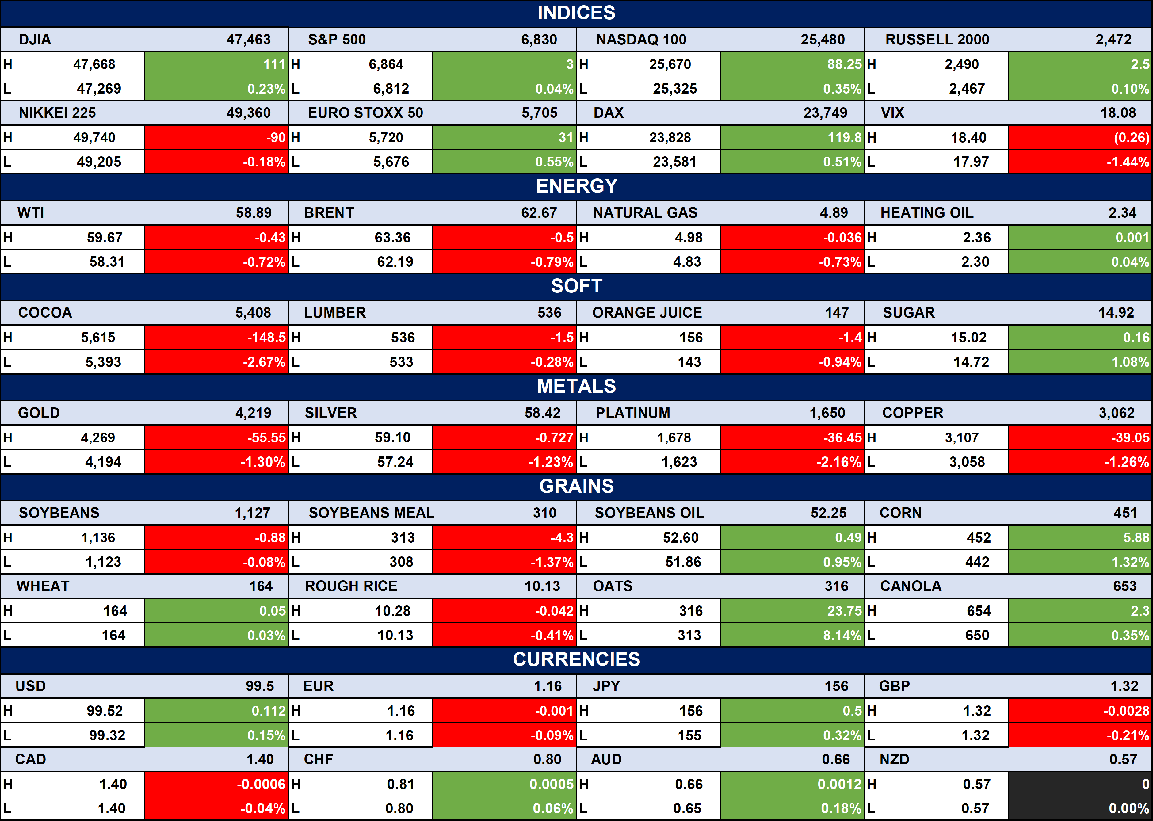 Grains and soft commodities were mixed, with corn, oats, canola, and soybean oil up, while cocoa, lumber, orange juice, and soybean meal fell; currencies were mostly stable, with slight gains in USD and minor losses in GBP.