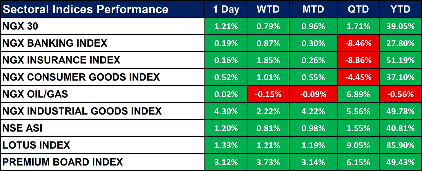 The table below shows that the Nigerian stock market showed broad-based gains, with the NGX 30 up 1.21% and the NSE ASI rising 1.20% for the day.