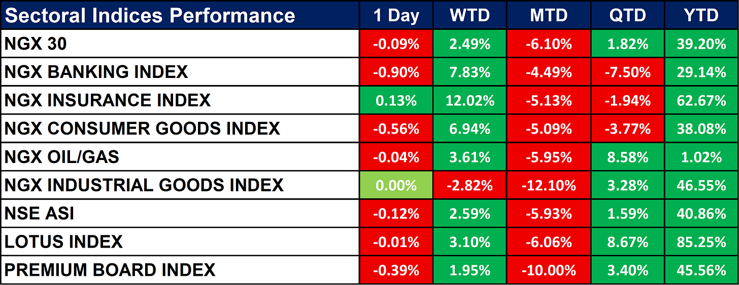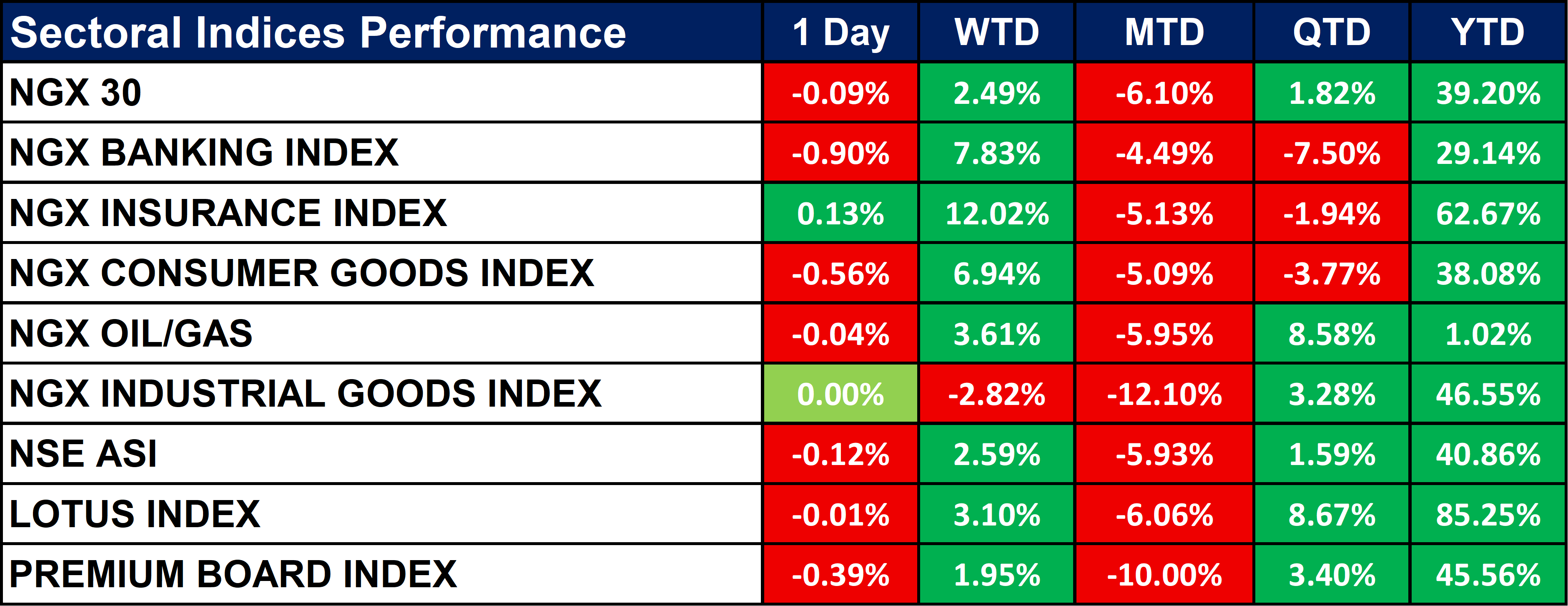 The table below shows that the Nigerian equities were broadly negative on the day, with most sectoral indices posting mild declines, led by Banking (-0.90%) and Consumer Goods (-0.56%). Despite the daily pullback, weekly performance remains positive across sectors, supported by strong gains in Insurance (+12.02% WTD) and Banking (+7.83% WTD). Month-to-date performance is weak across the board, but year-to-date returns remain firmly positive, with Lotus (+85.25% YTD), Insurance (+62.67% YTD), and Industrial Goods (+46.55% YTD) leading.