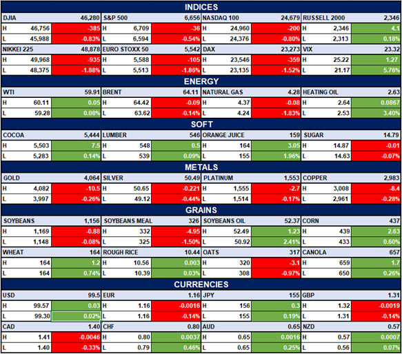 The table below depicts that the Global equities mostly traded lower, with major indices like the S&P 500, Nasdaq 100, Euro Stoxx 50, and DAX posting declines, while volatility (VIX) ticked higher. Commodities showed mixed performance: crude oil was slightly down, natural gas dropped sharply, while soft commodities like cocoa and orange juice gained. Currencies were broadly stable, with minor moves across USD, EUR, GBP, and JPY, showing no major directional shift.