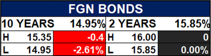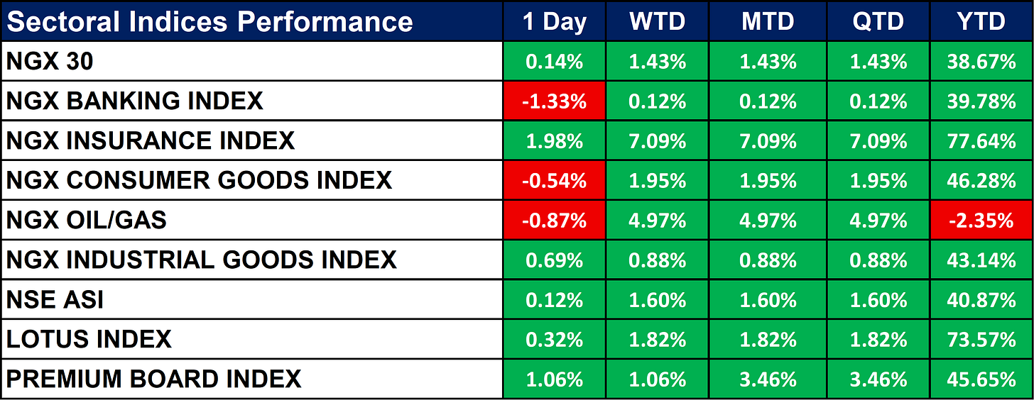 Insurance (+1.98%) and Industrial Goods (+0.69%) led gains, driving a mild overall uptick in the All-Share Index (+0.12%). Year-to-date, Insurance (+77.64%) and Lotus (+73.57%) remain the best performers, while Oil/Gas lags at -2.35%.Fixed Income (FGN Bonds)