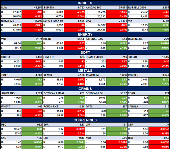 The table below depicts that the Global markets closed mixed. U.S. and European indices fell slightly, led by Nasdaq (-0.45%) and Nikkei (-1.4%). Energy prices was mixed, with Brent down (-0.05%) and Natural Gas gaining 2.44%. Most commodities declined, especially Cocoa (-2.3%) and Silver (-1.18%), while the USD strengthened broadly against major currencies.
