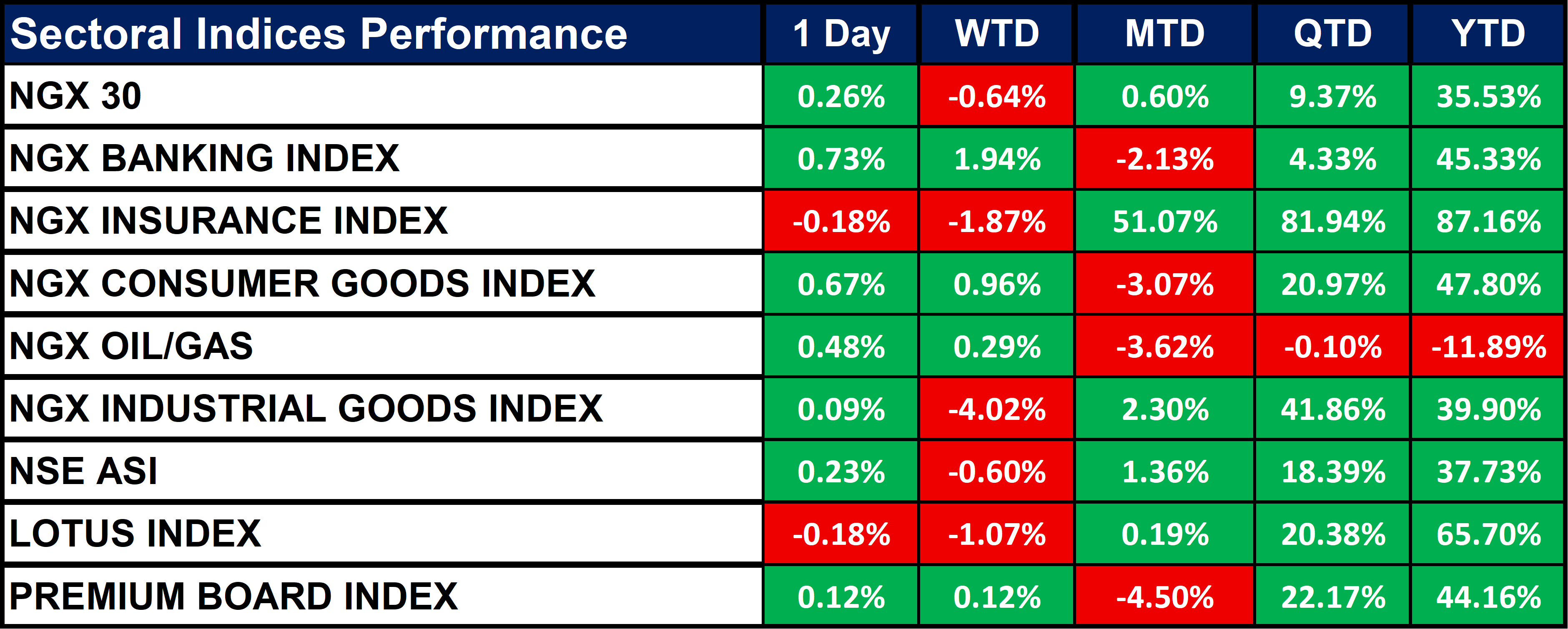 The table below shows that NGX indices were mixed: Banking and Consumer Goods led gains, Insurance slipped slightly. Week-to-date, Industrial Goods dragged, while Banking advanced. Month-to-date, Insurance soared over 51%, but Oil/Gas and Premium Board fell. Year-to-date, Insurance (+87%) and Lotus (+66%) are strongest, while Oil/Gas remains the only loser (-12%).