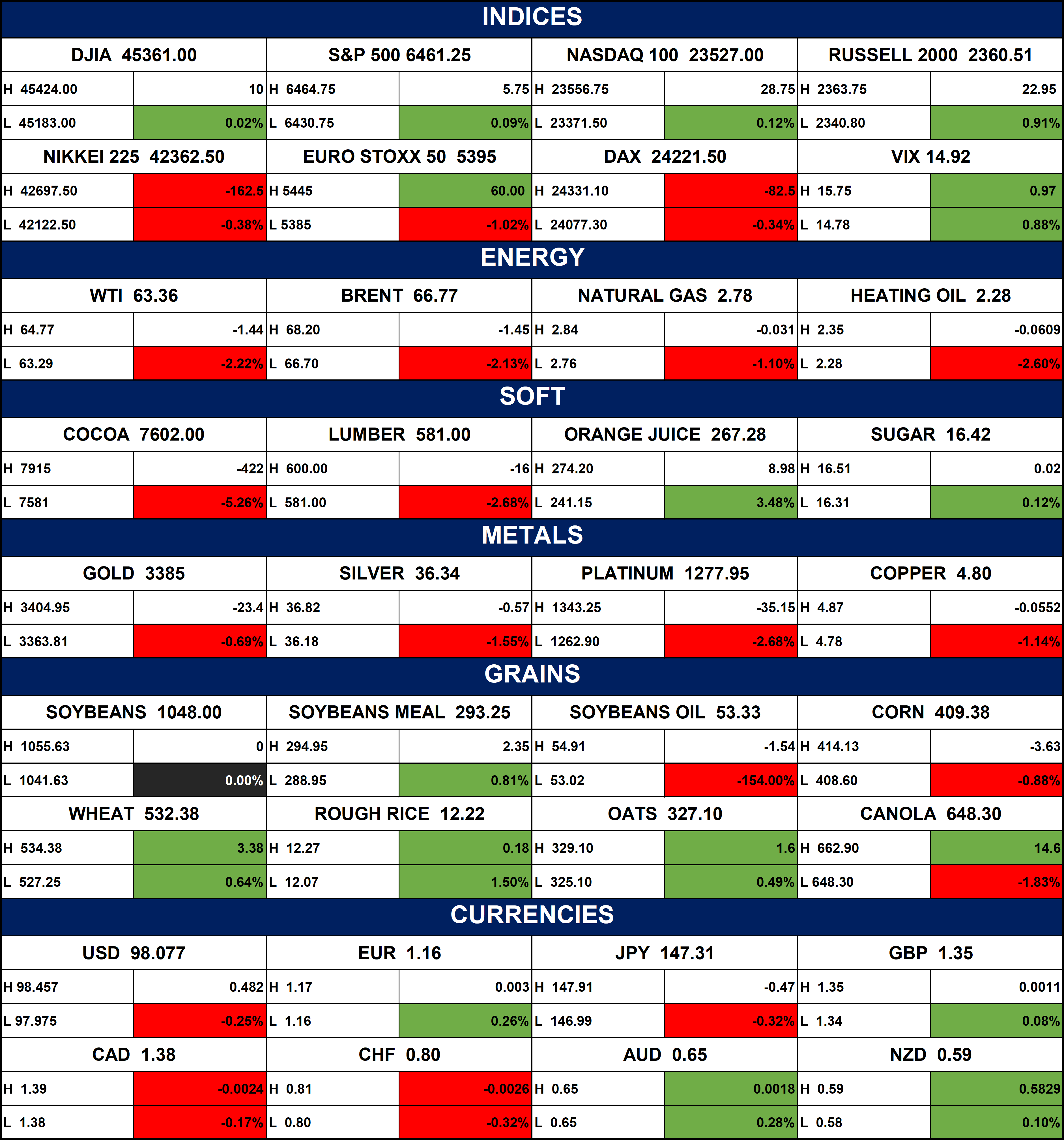The table below depicts that the U.S. indices showed slight gains, while European and Asian indices weakened. Energy and metals were broadly lower, soft commodities were mixed, grains mostly strengthened, and currencies were mixed with the USD weakening.