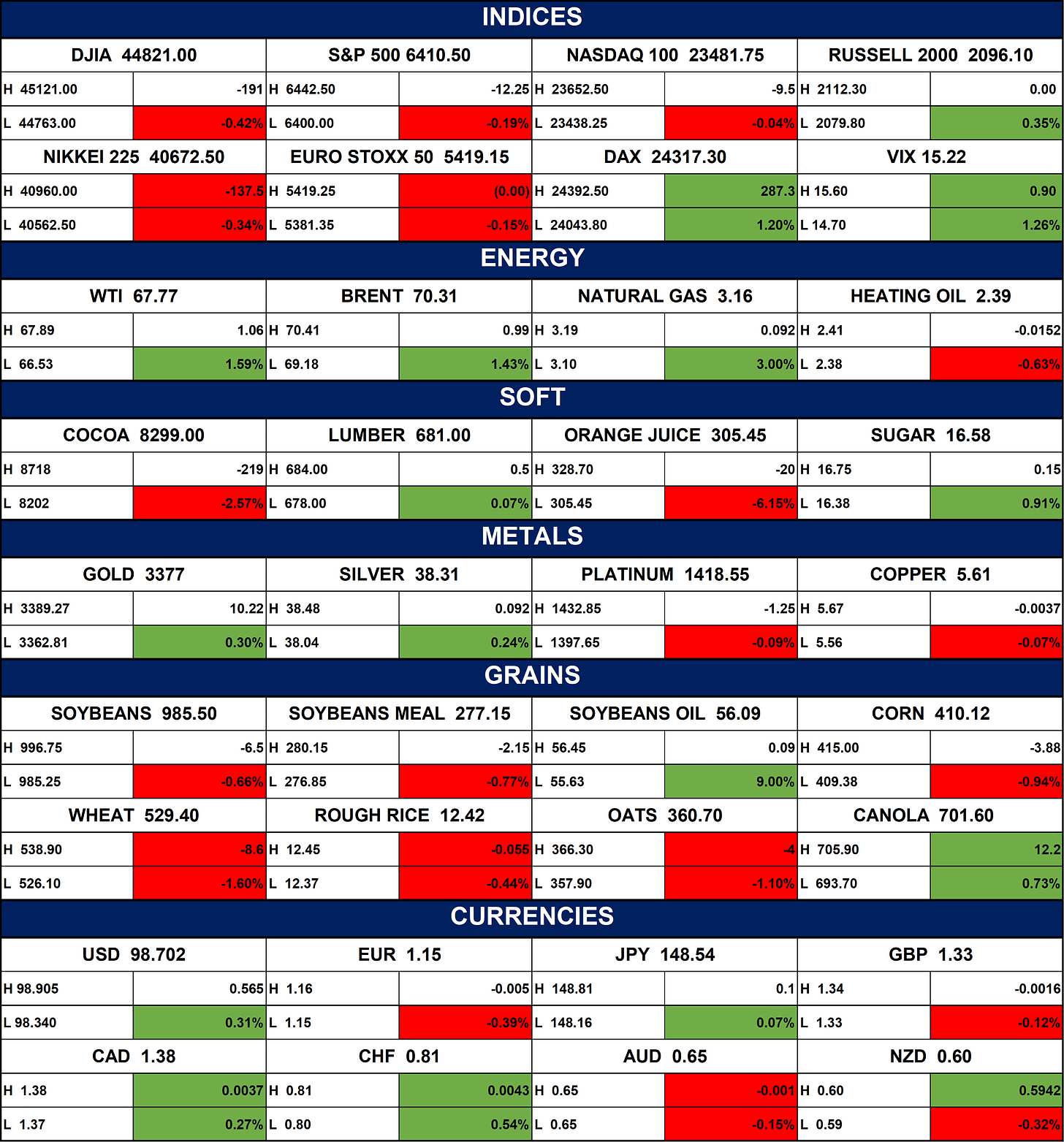 The table below depicts that markets were mixed with a slight downturn in major indices and a rise in volatility (VIX +1.26%). Energy prices climbed, led by natural gas (+3.00%) and WTI crude (+1.59%). Softs and grains were mostly lower, except for a sharp +9.00% gain in soybean oil. Gold and silver posted small gains. In currencies, the U.S. dollar and Swiss franc strengthened, while euro, pound, and kiwi dollar weakened.