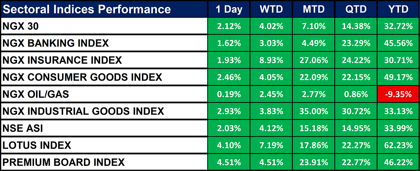 The table below shows that he NGX sectoral indices showed broad positive performance across all timeframes, with Consumer Goods (+49.17%), Banking (+45.56%), and Lotus Index (+62.23%) leading year-to-date (YTD) gains. The Oil/Gas sector is the only laggard, down -9.35% YTD. The Premium Board and Lotus Index posted the highest 1-day gains at +4.51% and +4.10%, respectively, indicating strong investor interest in top-tier and Shariah-compliant stocks.