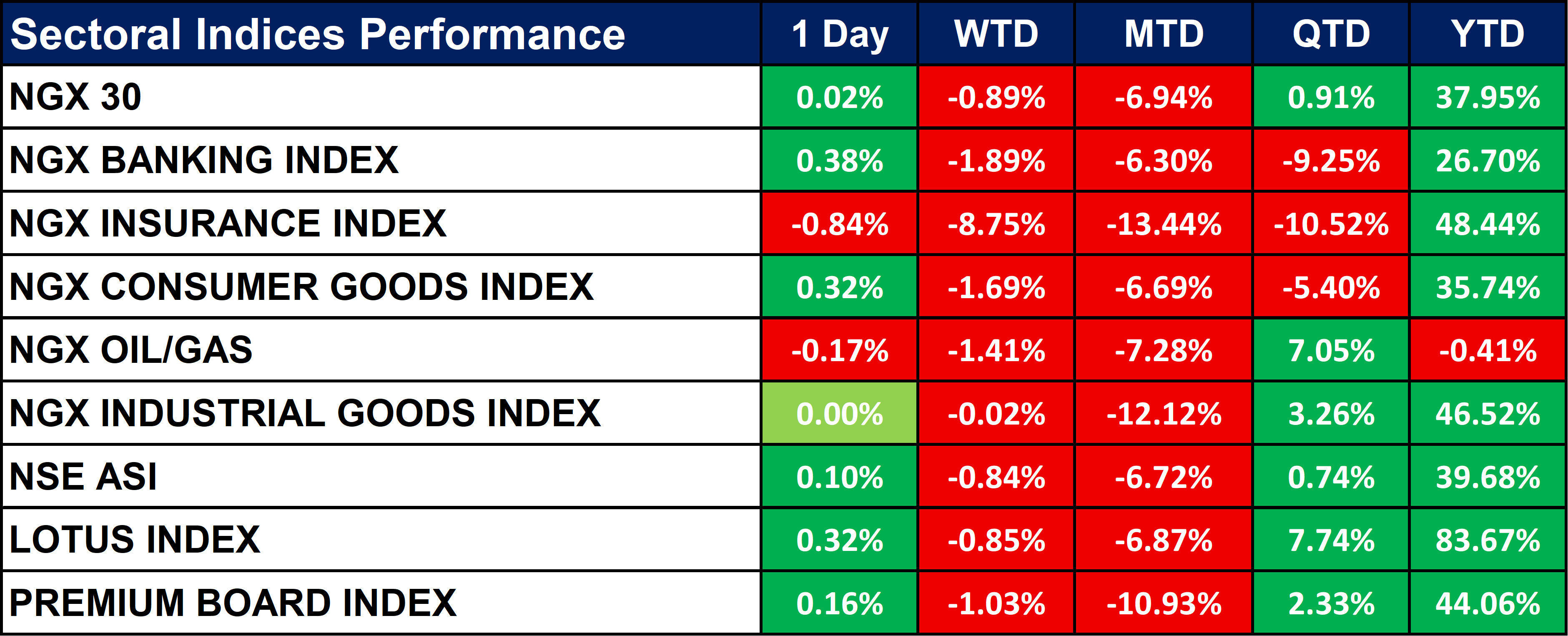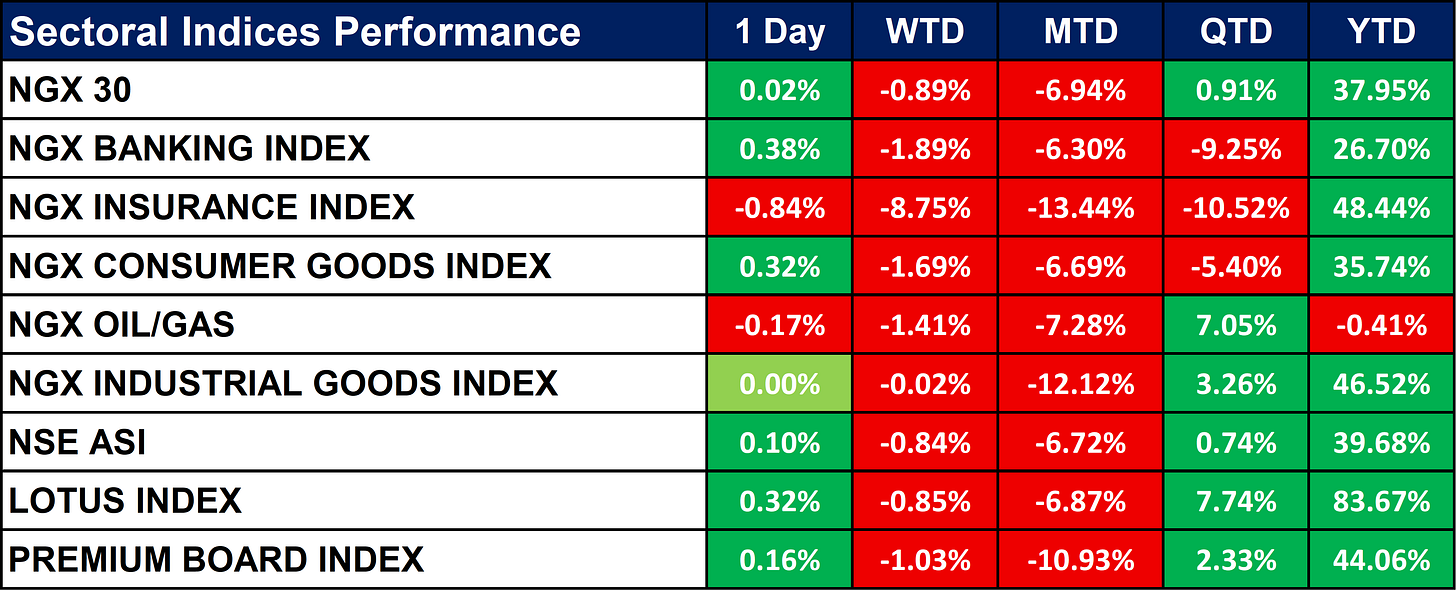 The table below shows that the Nigerian equities saw mild gains on the day, with most sector indices closing slightly positive despite broad month-to-date losses.