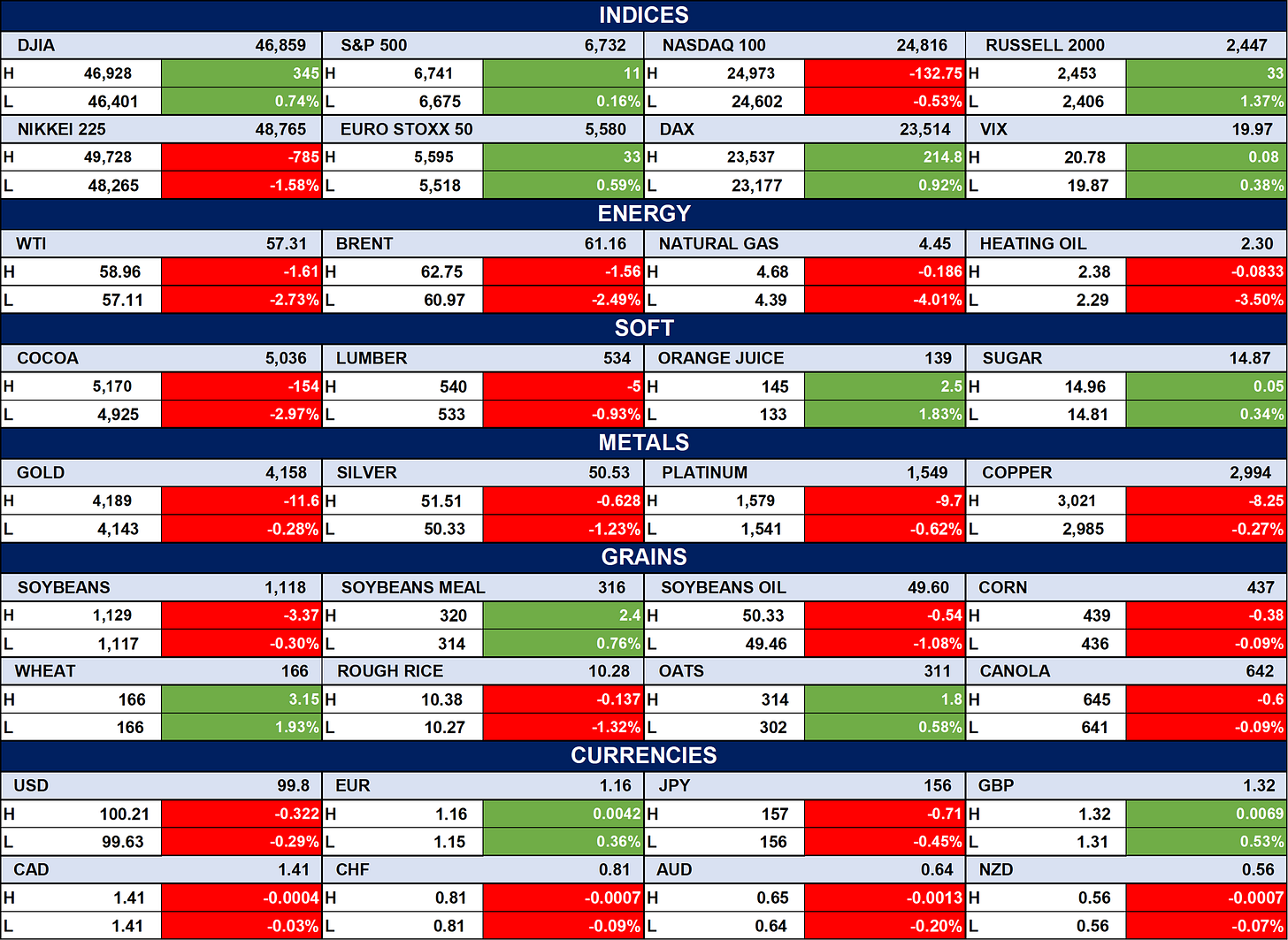 The table below depicts that the Global indices show mixed performance, with the S&P 500 and DAX slightly up while the Nasdaq 100 dipped. Energy commodities mostly declined, particularly natural gas and heating oil, while metals and soft commodities showed varied movement. Major currencies traded within narrow ranges, with slight strength in the EUR and weakness in the USD and YEN.