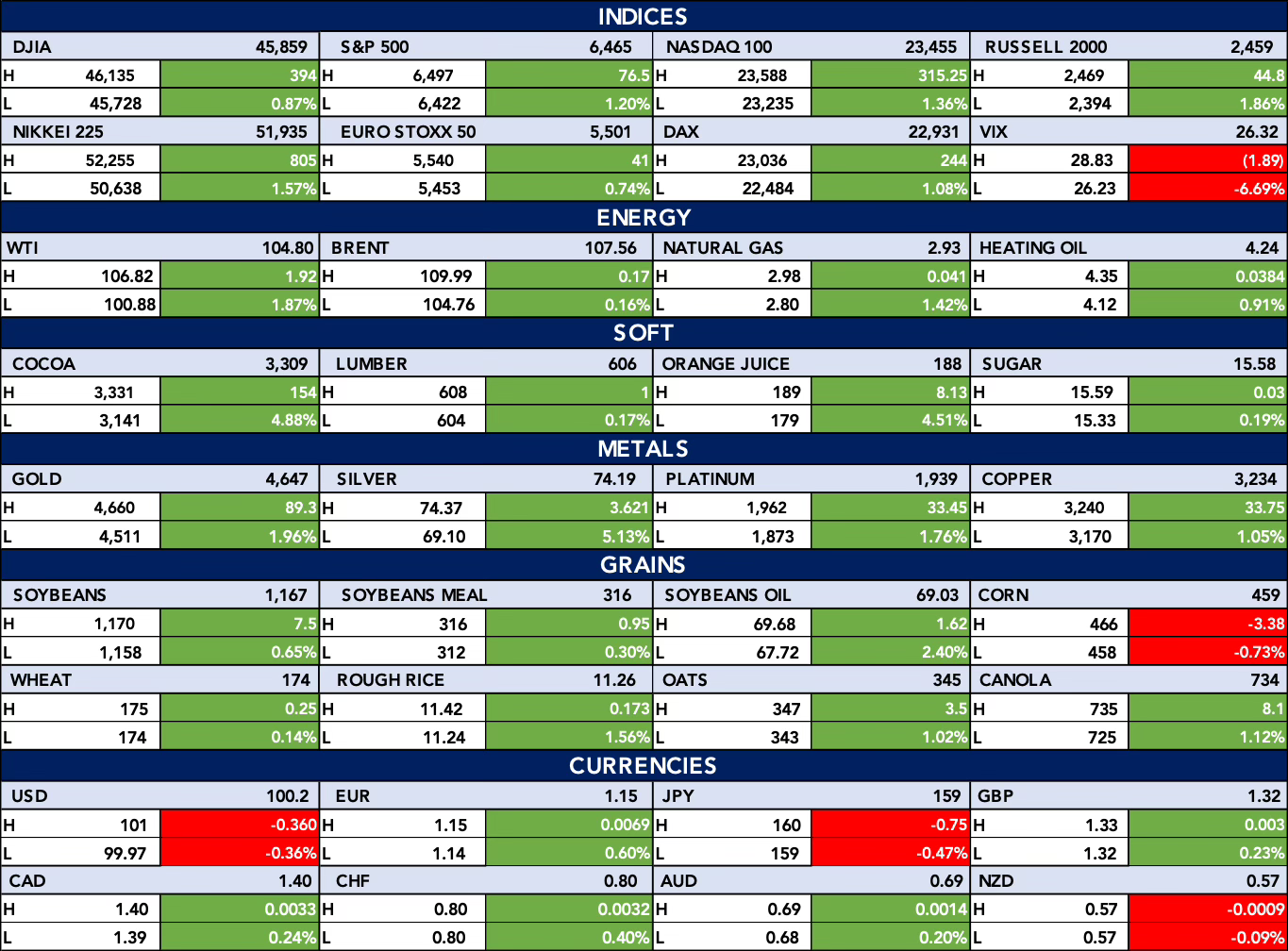 The table below shows that Global equities advanced broadly, led by gains in the S&P 500 (+1.20%) and Nasdaq 100 (+1.36%), while the VIX declined sharply (-6.69%), signalling easing market volatility. Commodities were firm across the board, with crude prices holding above $100, metals (silver +5.13%) and softs (cocoa +4.88%, orange juice +4.51%) driving upside momentum. In currencies, the dollar softened while most majors strengthened, though the yen lagged, and grains showed mixed performance with corn as the notable decliner.