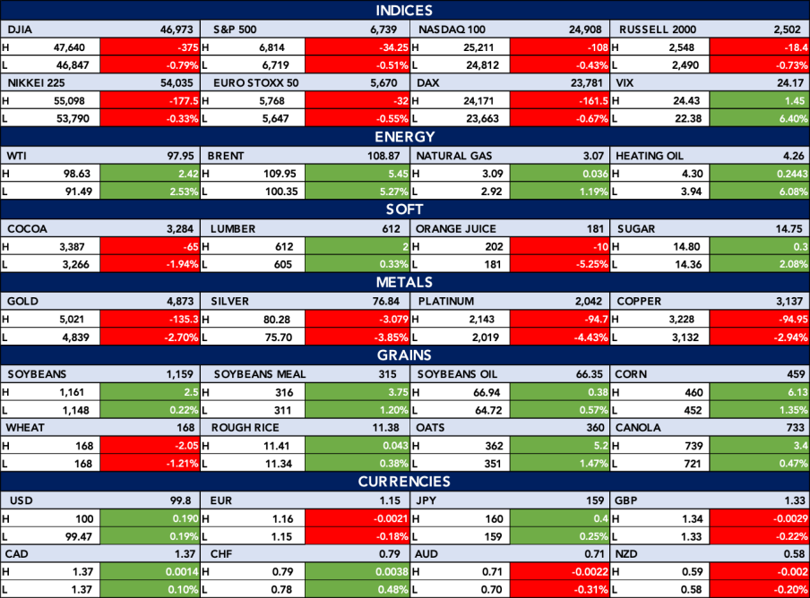 The table below shows that Global equity markets are broadly weaker, with declines across U.S. indices (Dow, S&P 500, Nasdaq), Europe (DAX, Euro Stoxx 50), and Japan (Nikkei), while volatility (VIX) is rising. Energy markets are strong across the board, with gains in crude oil (WTI, Brent), natural gas, and heating oil, indicating firm demand or supply constraints. Metals are under pressure with notable losses in gold, silver, platinum, and copper, while commodities are mixed grains mostly higher, softs uneven and the U.S. dollar is firm against most currencies.