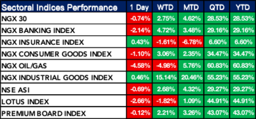 In the table below, most NGX sectors show strong year-to-date performance, led by Oil/Gas and Industrial Goods with gains above 50–60%, followed by Consumer Goods and Premium Board. However, short-term performance is mixed, as several key sectors including Banking, Consumer Goods, and Oil/Gas record notable daily losses. Industrial Goods stands out with consistent strength across all timeframes, especially week-to-date and month-to-date. In contrast, the Insurance sector lags, with negative week-to-date and month-to-date returns despite modest gains over the longer term.