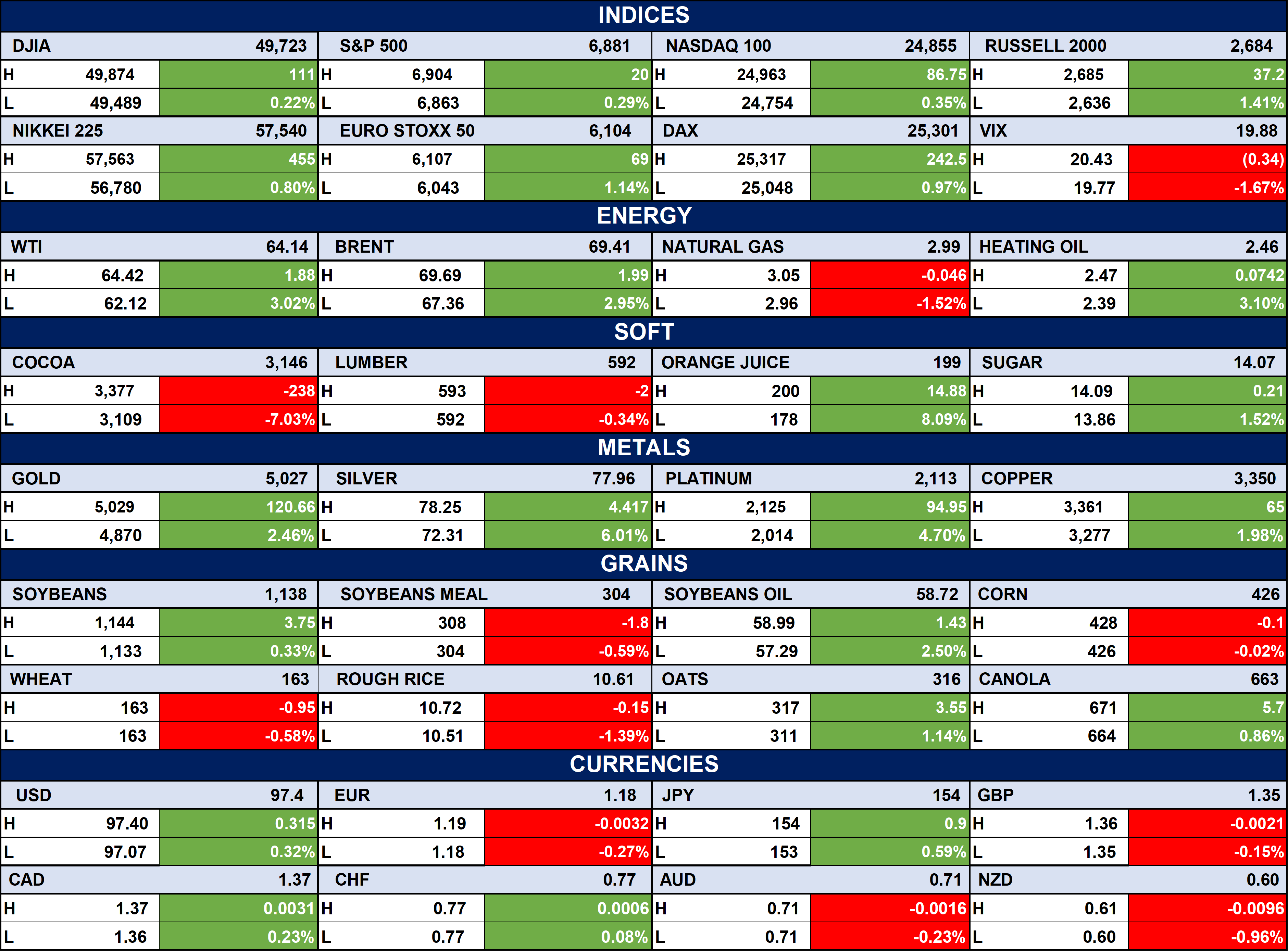 The table below depicts that the Global equities closed broadly higher, with gains across the S&P 500, Nasdaq 100, DJIA, and European indices, while the VIX declined, signalling improved investor risk appetite. Energy prices strengthened as WTI and Brent advanced, metals particularly gold and silver posted solid gains, while soft commodities showed mixed performance with cocoa sharply lower. In currencies, the US dollar remained firm overall, commodities-linked currencies were mixed, and most grain prices traded sideways to slightly positive, reflecting cautious but stable global market sentiment.