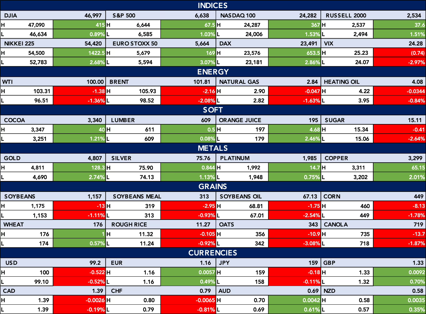 The table below shows, Global markets are broadly higher, with major equity indices advancing led by strong gains in Europe and Asia, while volatility eased as the VIX declined. Energy markets softened, with crude oil and natural gas pulling back, whereas metals rallied sharply, led by gold, silver, and copper posting solid gains. Agricultural commodities were mostly weaker, while currency markets showed a softer U.S. dollar alongside modest strength in the euro, pound, and commodity linked currencies.