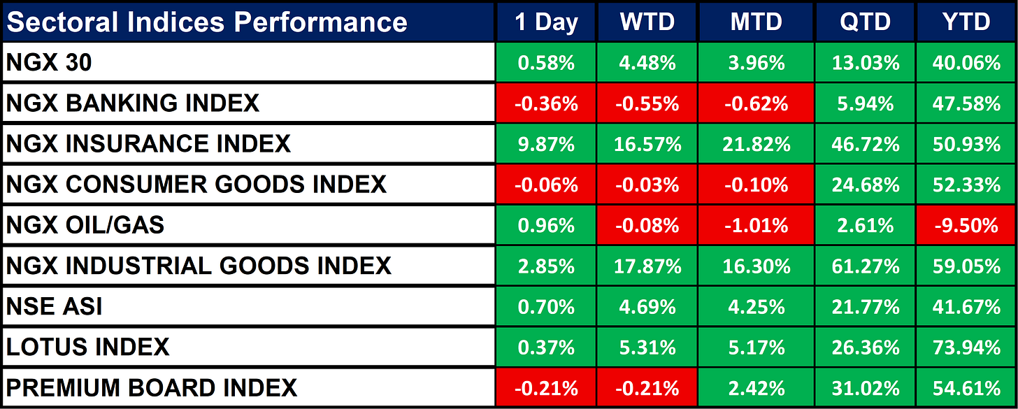 The table below shows that the Nigerian equity market continues to show broad-based strength led by Industrial Goods, Insurance, and Sharia-compliant stocks (Lotus Index). However, Oil & Gas remains under pressure. Investor sentiment appears strong, with most indices posting double-digit growth for the quarter and year.