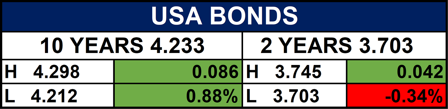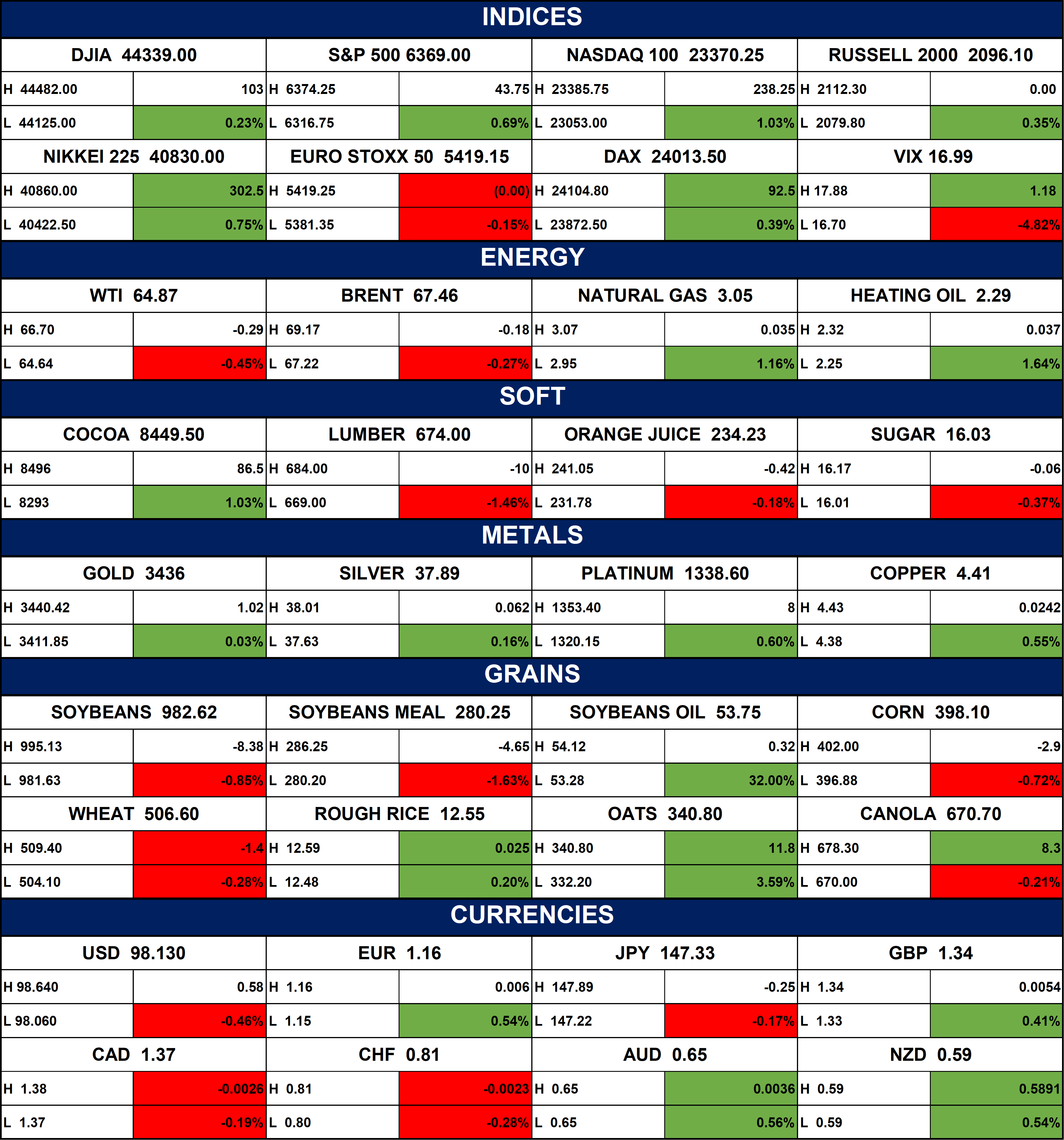 The table below depicts that the Global markets edged higher, with major indices like the S&P 500, Nasdaq 100, and Nikkei 225 posting gains. Energy prices were mixed, with natural gas and heating oil up, while crude oil dipped. Cocoa and oats led commodity gains, while soybeans, corn, and lumber declined. Metals saw modest gains across the board. The U.S. dollar weakened, while other major currencies showed slight movements.